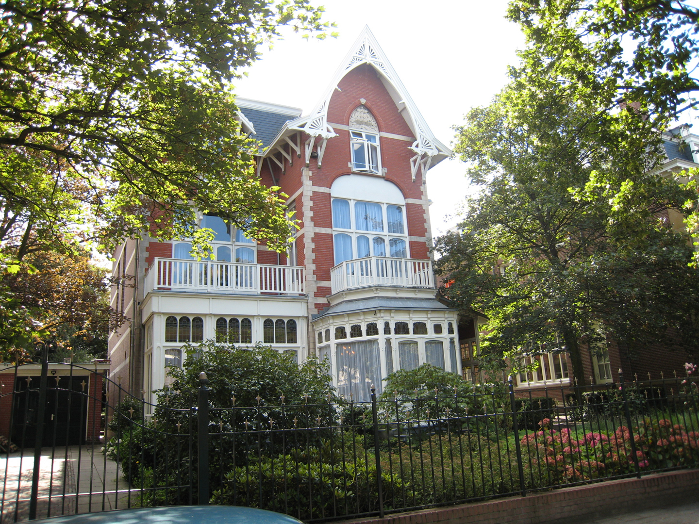 De voordeur bevindt zich rechts van de voorgevel en bezit een houten portaal met bordes waarin mozaiekversiering, snijwerk, glas-in-lood en een lessenaarsdak. De voordeur is versierd met panelen, bezit siertraliewerk in eenvoudige Art Nouveauvormen en heeft een bovenlicht met snijwerk binnen een rondboogomlijsting. De achtergevel bezit vensters met ontlastingsbogen en twee dakkapellen boven de gootlijst. Tegen de achtergevel een rechthoekige houten erker met glas-in-lood in het bovenlicht en een balkon.