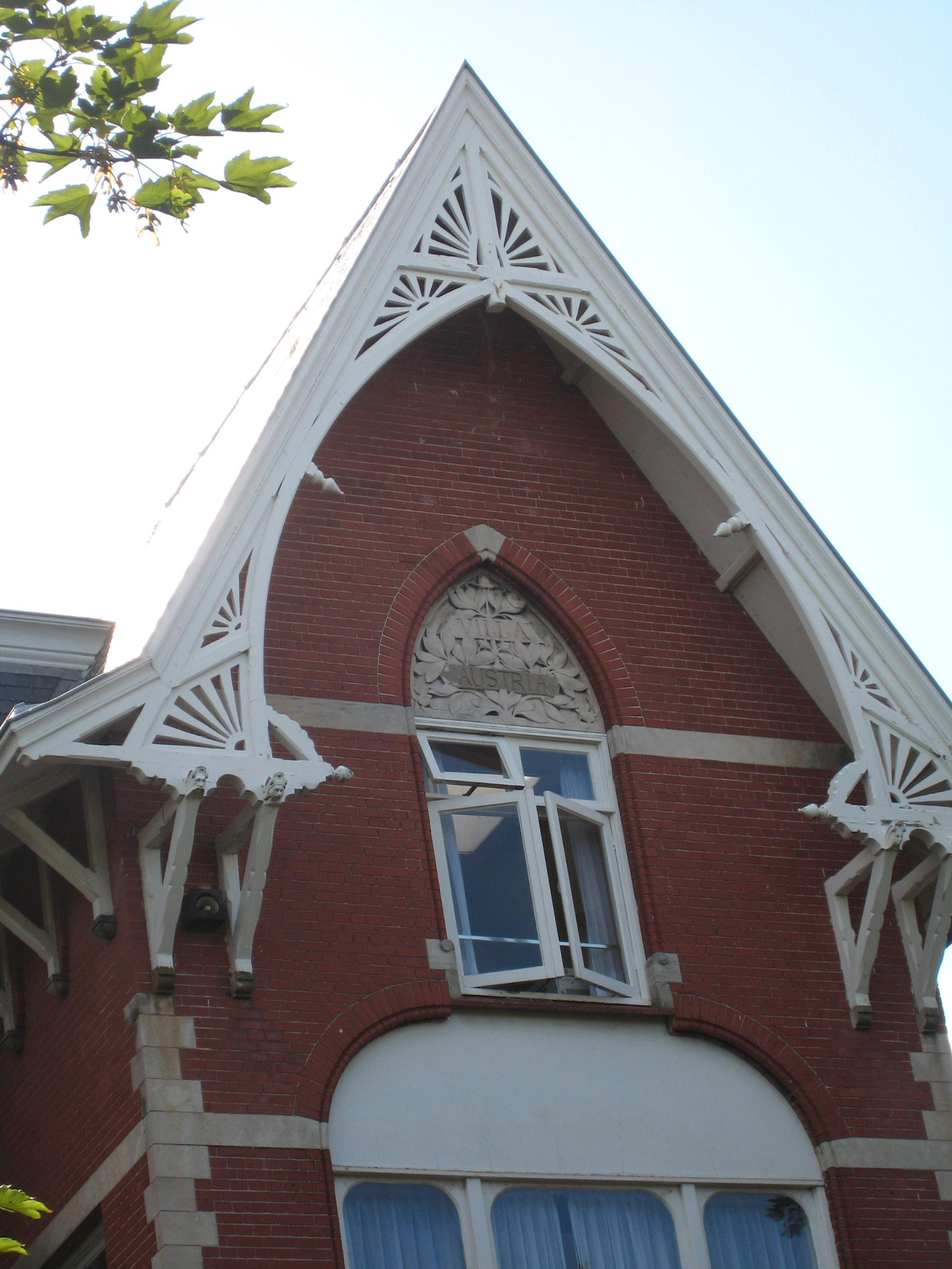 De villa is in baksteen opgetrokken en bestaat uit een kelder en twee bouwlagen met een kapverdieping in het met shingles gedekte omlopende, overstekende en afgeknotte schilddak dat boven de vooruitspringende rechter travee een zadeldakvormige zijkap heeft. De voorgevel is bekleed met rode verblendsteen; de andere gevels vertonen rood-bruine baksteen. De gevels worden verlevendigd door gecementeerde banden en hoekkettingen, de plint en de vensterdorpels zijn uitgevoerd in hardsteen. De kap is aan de voorzijde chaletvormig beëindigd met een overstek, rijk versierd met gesneden windveer en korbelen met maskerkoppen. Het terugliggende linker gedeelte van de villa bezit een door de gootlijst heenbrekende gemetselde dakkapel met balkon en overstek op met maskerkoppen versierde korbelen. Het zoldervenster van de puntgevel onder de windveer is gevat in een spitsbogige omlijsting, die in het boogveld een gebeeldhouwde decoratieve vulling vertoont, waarin het opschrift "Villa Austria", welk opschrift de oorspronkelijke naam "Villa Maria" sinds l923 vervangt. De verdieping heeft in de voorgevel brede, driedelige vensters met openslaande deuren en bovenlichten. Tegen het vooruitspringende rechter deel is op de parterre een houten, vijfzijdige erker uitgebouwd, terwijl het terugliggende linker gedeelte een houten veranda bezit, beide met bovenlichten, voorzien van glas-in-lood uit de bouwtijd en balkons met houten hekken.