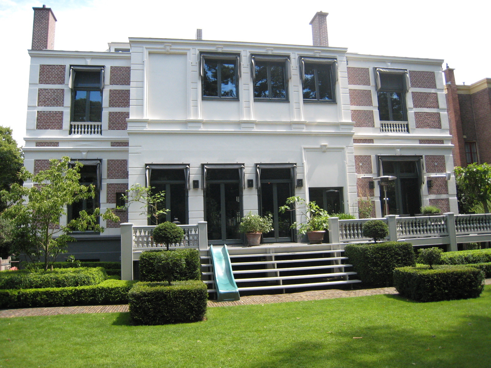 Pand bestaande uit souterrain, beletage en verdieping onder een met shingles gedekt afgeknot schilddak, vijf vensterassen breed en drie vensterassen diep. De in schoon metselwerk opgetrokken gevels worden verlevendigd door wit gepleisterde sierbanden. De voorgevel heeft een als risaliet uitgevoerde middenpartij, afgedekt door een fronton met oculus. Op de begane grond zijn drie houten vensters die gescheiden worden door muurdammen met kapitelen. Voor de drie gekoppelde rondboogvensters op de verdieping van de middenrisaliet, loopt een breed balkon met balustrade. De houten vensters worden door smalle gecanneleerde kolommen gescheiden. Het balkon wordt gedragen door rijk versierde voluutconsoles. Boven de terugliggende zijvlakken van de voorgevel zijn in het brede fries van de kroonlijst zoldervensters met balustrades aangebracht. Ook voor de vensters op de verdieping en de openslaande deuren op de parterre zijn balustrades. In de linker zijgevel is de hoofdingang. De achtergevel waar de toegang naar het souterrain is, bezit een gepleisterde middenrisaliet. Op de eerste verdieping zijn hier twee blindnissen. Waardering.