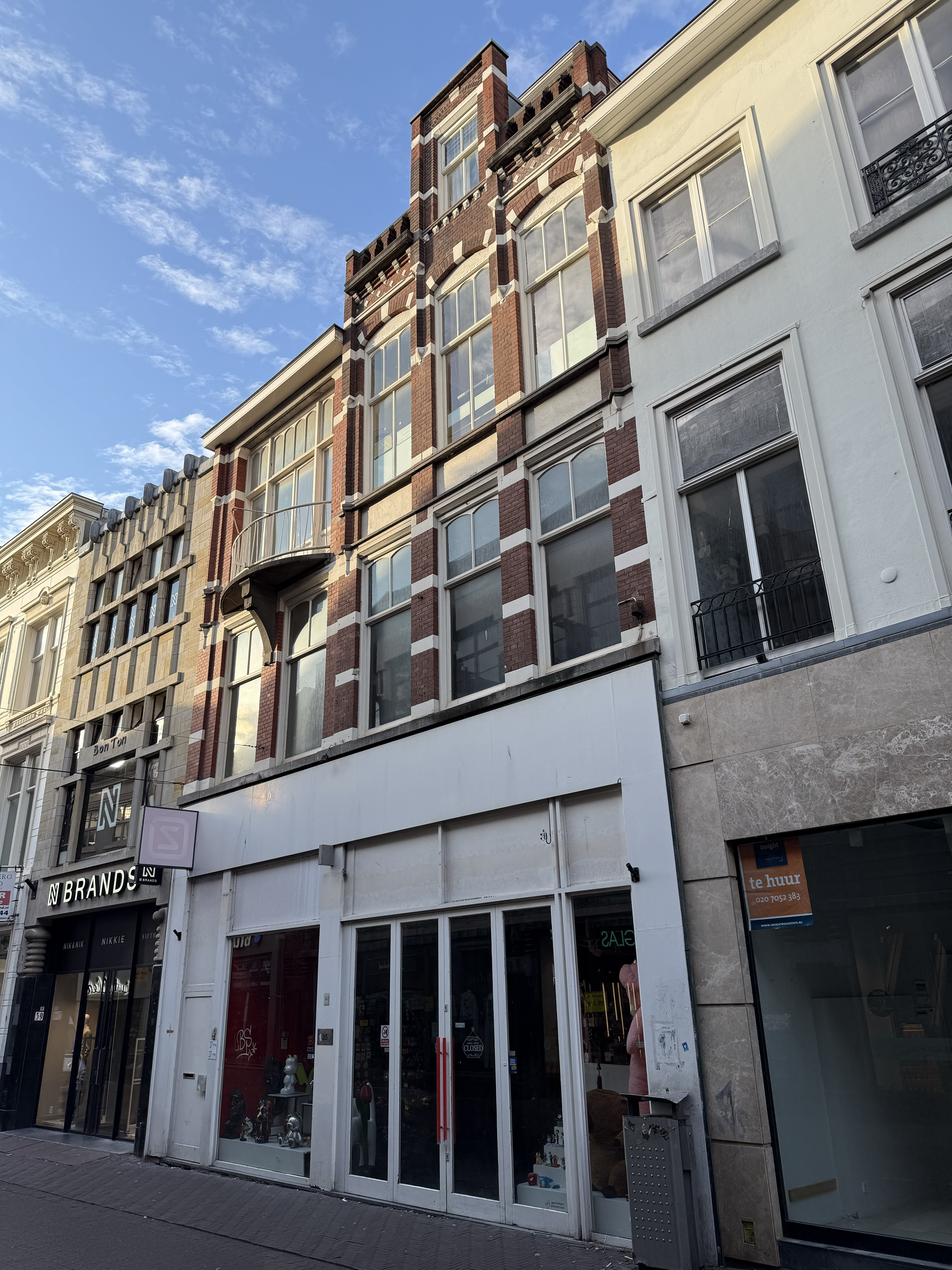 De Venestraat is als sinds de late middeleeuwen een straat waar bedrijvigheid en handel waren geconcentreerd. Rond 1850 doet het winkelconcept zoals wij dat nu kennen haar intrede en worden veel woonhuis- en bedrijfspuien in de bestaande bebouwing vervangen door winkelpuien. De voortschrijdende cityvorming van de binnenstad en daarmee het alsmaar belangrijker worden van de winkelfunctie voor de Venestraat zorgt ervoor dat vanaf 1870 een groot aantal van de oude panden wordt vervangen. De nieuwe winkel-woonpanden panden zijn vaak breder en laten de rijke schakering zien van de snel opvolgende architectuurstijlen vanaf 1870 tot aan het Interbellum. Venestraat 35-37 is hiervan een goede representant. Het oorspronkelijke ontwerp voor het woon-winkelpand uit 1899 (nr. 35) telde aan de Venestraat drie vensterassen en verbrede zich naar achteren. De in schoon metselwerk opgetrokken voorgevel heeft de stijlkenmerken van de voor die periode kenmerkende sobere neo-renaissance. De middelste travee is opgetrokken tot een vlaamse gevel. Opvallend is tevens de beëindiging met een balustrade van de zijtraveeën. In 1908 vindt een ingrijpende verbouwing en verbreding van het pand plaats in opdracht van de Levensverzekering maatschappij "Utrecht". De gevel wordt aan de linker zijde verbreed (nr. 37) met een forse travee van drie bouwlagen onder plat dak in dezelfde stijl als het bestaande. De winkelpui is in de loop der decennia meerdere malen gewijzigd.