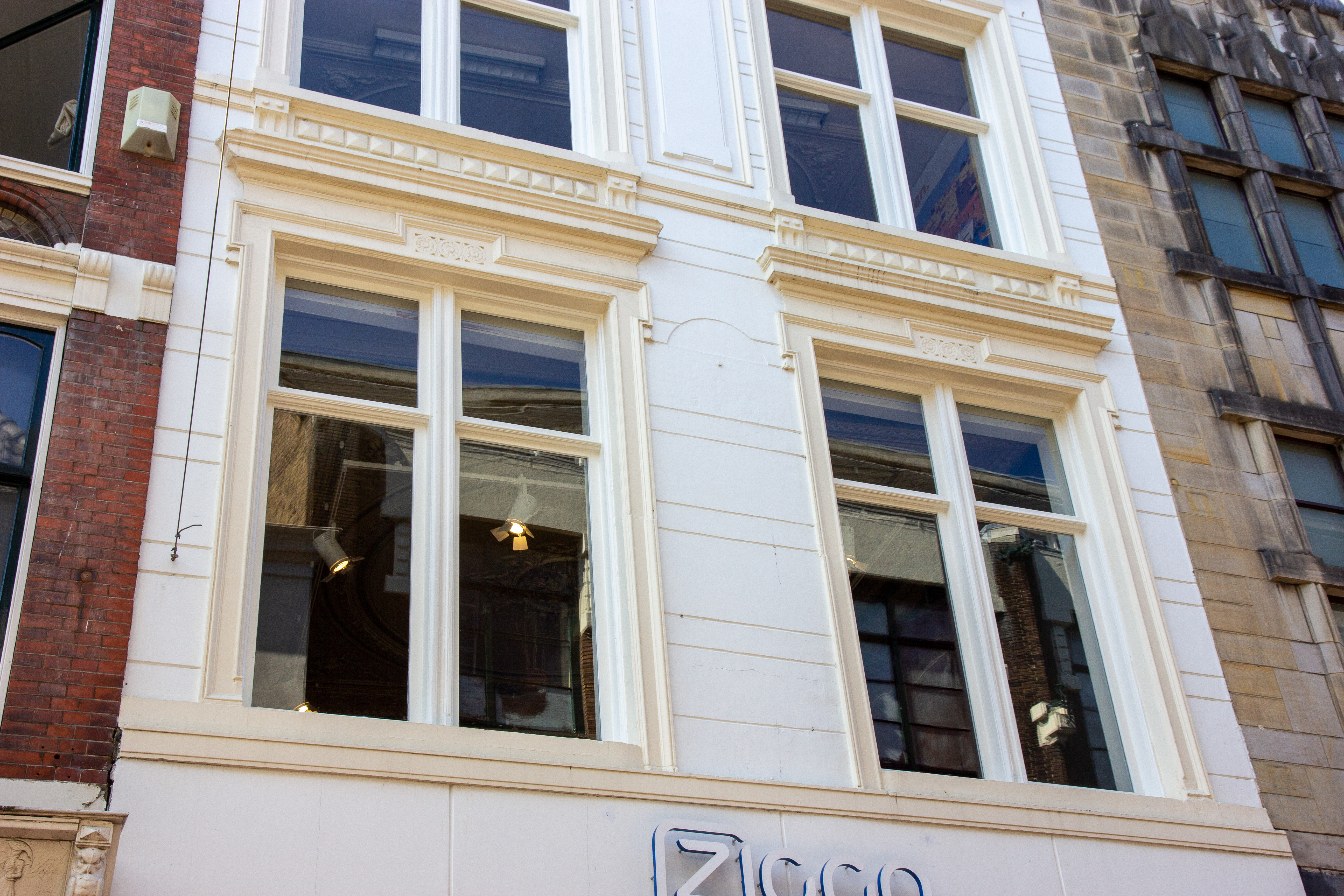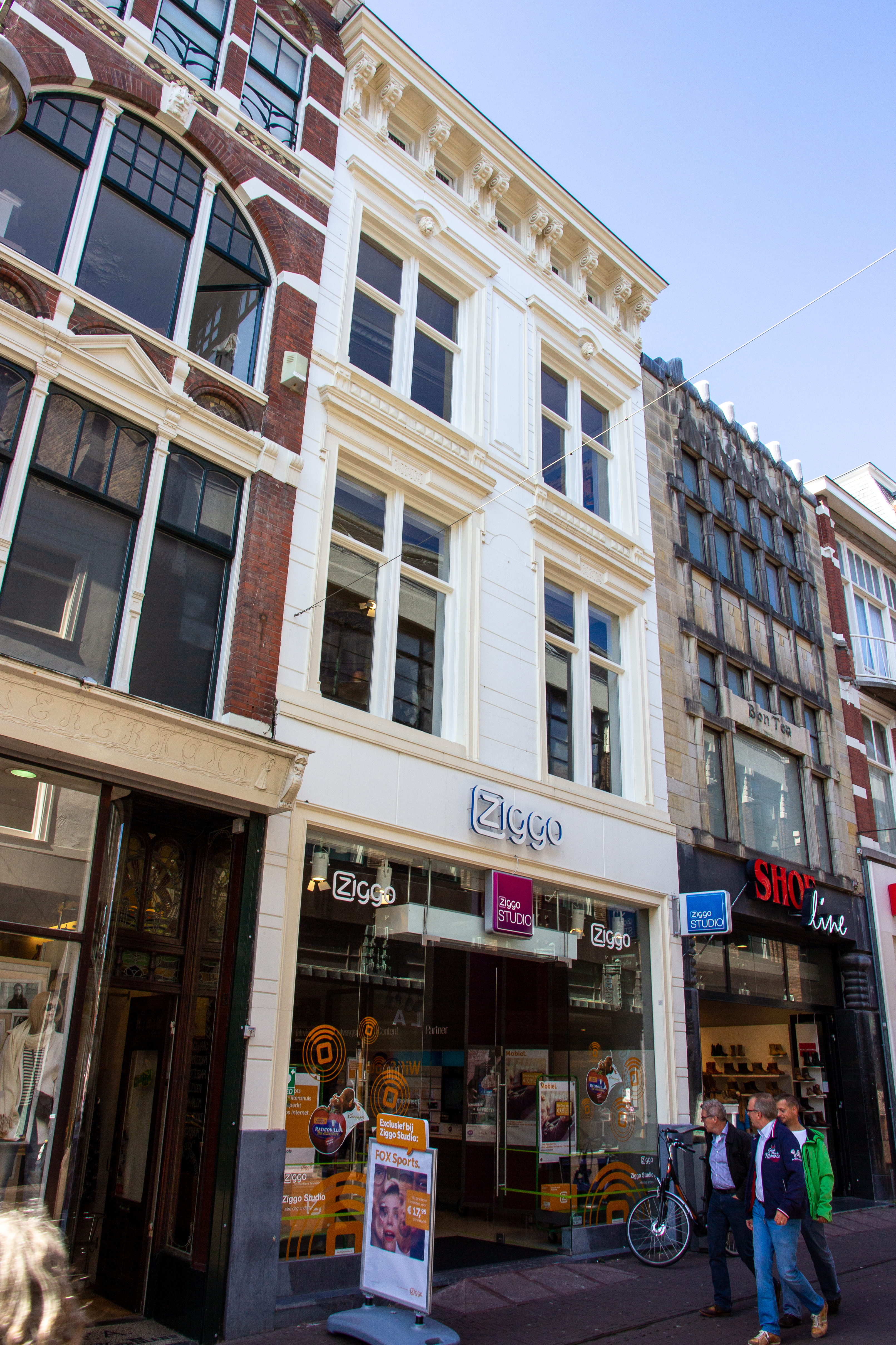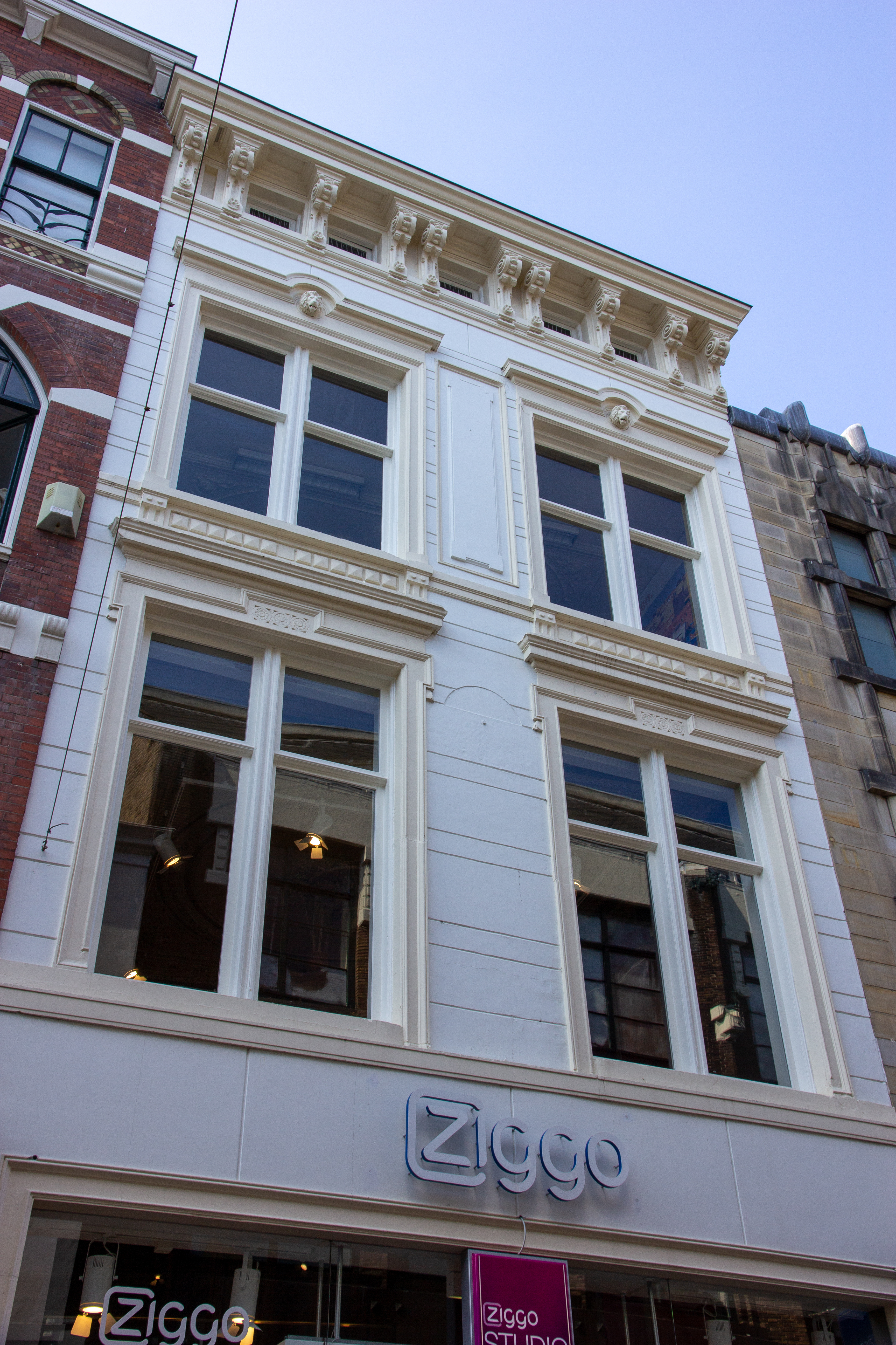 Als winkel-woonpand ontworpen pand uit circa 1875 in rijke eclectische architectuur bestaande uit drie bouwlagen onder een kap.