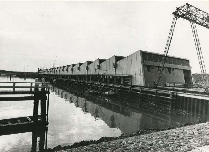 Bedrijfsgebouw met kantoor, veilingzaal, op- en overslagruimtes, kade en laadperron.