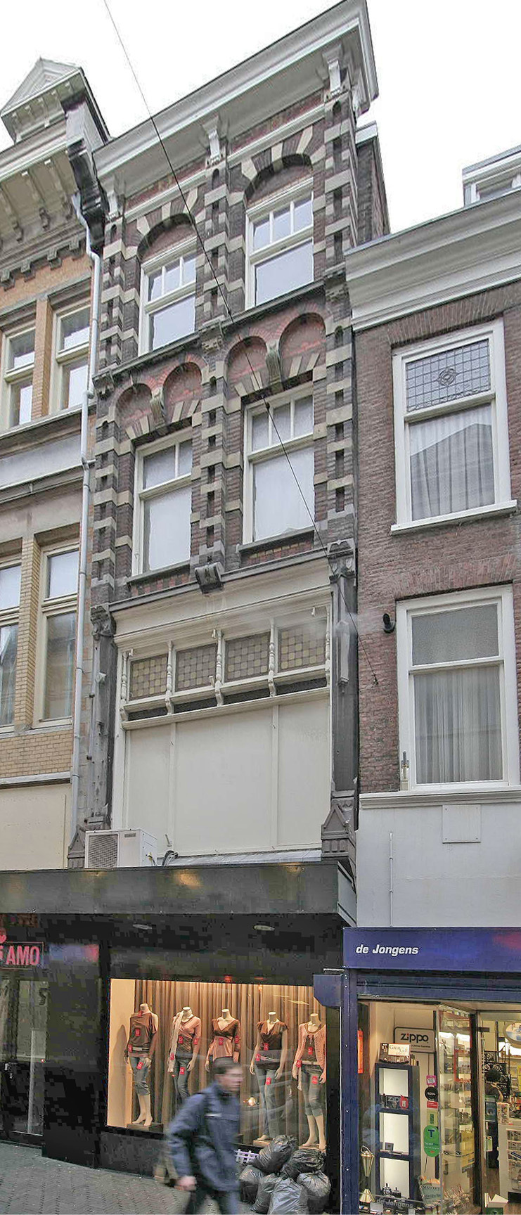 De twee assen brede voorgevel is uitgevoerd in een rijke neo-renaissance met een in siermetselwerk uitgevoerde derde en vierde bouwlaag waarin tevens tal van natuurstenen onderdelen als speklagen, consoles en sluitstenen zijn verwerkt. Een opvallend element is de op de eerste verdieping bewaard gebleven brede etalagevenster van een in oorsprong over twee bouwlagen opgetrokken winkelpui. De oorspronkelijke pui op de begane grond is gemoderniseerd en vormt nu onderdeel van een doorlopende winkelruimte met het linker buurpand.