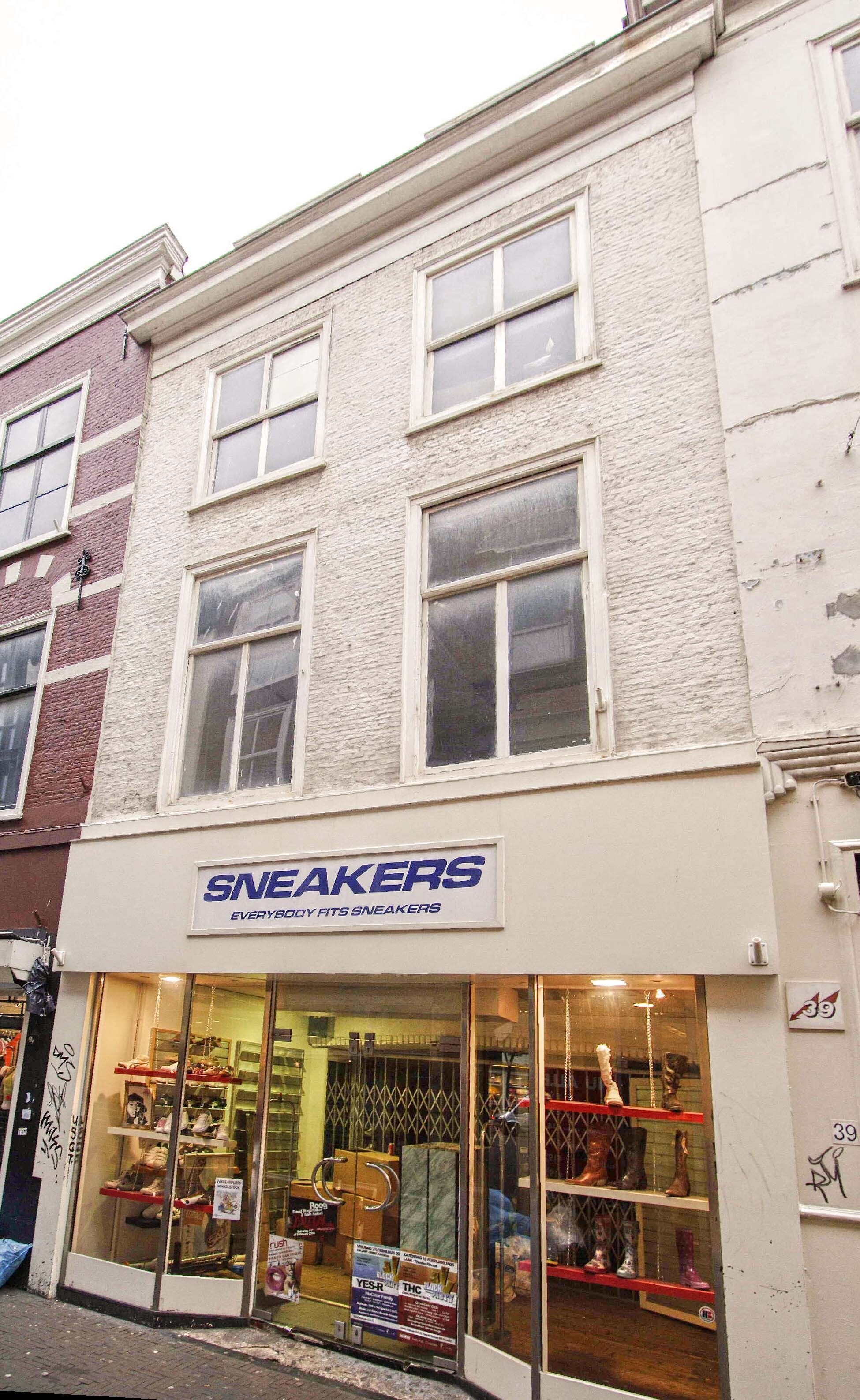 De exacte ouderdom van het pand is niet bekend maar is van ten minste zeventiende-eeuwse oorsprong. In de samengestelde balklaag van de eerste verdieping overspant de onderslagbalk of moerbalk het huis in zijn langste richting, namelijk van de voor- naar de achtergevel. Haaks hierop liggen dwarsbalken (kinderbinten). Het ter rechterzijde gelegen buurpand heeft een soortgelijke balklaag. Dit is een aanwijzing dat beide huizen oorspronkelijk deel uitmaakten van één tweelaags zestiende - of zeventiende-eeuws breed huis, zoals op oude kaarten is weergegeven. Uit de oudste bouwfase is naast de genoemde balklaag nog een spiltrap aanwezig tussen de eerste en tweede verdieping. De voorgevel is een achttiende-eeuwse lijstgevel van drie bouwlagen in schoonmetselwerk van handvormbaksteen, verdeeld in twee vensterassen. De witte beschildering behoort niet tot de oorspronkelijke opzet. In de hoeken van de gevel zijn hoekverbanden met klezoortjes herkenbaar. Boven de vensters bevinden zich eenvoudige rollagen. Op de eerste verdieping bevinden zich twee vensters, waarvan de kozijnen nog uit de achttiende eeuw dateren. De ramen stammen uit het midden van de negentiende eeuw maar bezaten aanvankelijk een zesruitsverdeling met brede middenroeden. De beide vensters op de tweede verdieping bestaan uit achttiende-eeuwse kozijnen met midden negentiende-eeuwse vierruitsramen. De winkelpui op de begane grond bestaat uit een omlijsting uit 1955 met een meer recente invulling. Uit de achttiende eeuw stamt ook nog de kapconstructie. Deze vangt al aan op de tweede verdieping en heeft een voor een dwarshuis kenmerkende opzet met een muurstijl tegen de voorgevel en spantbeen aan de achterzijde. De vloerbalken van de zoldervloer rusten op dit spant.