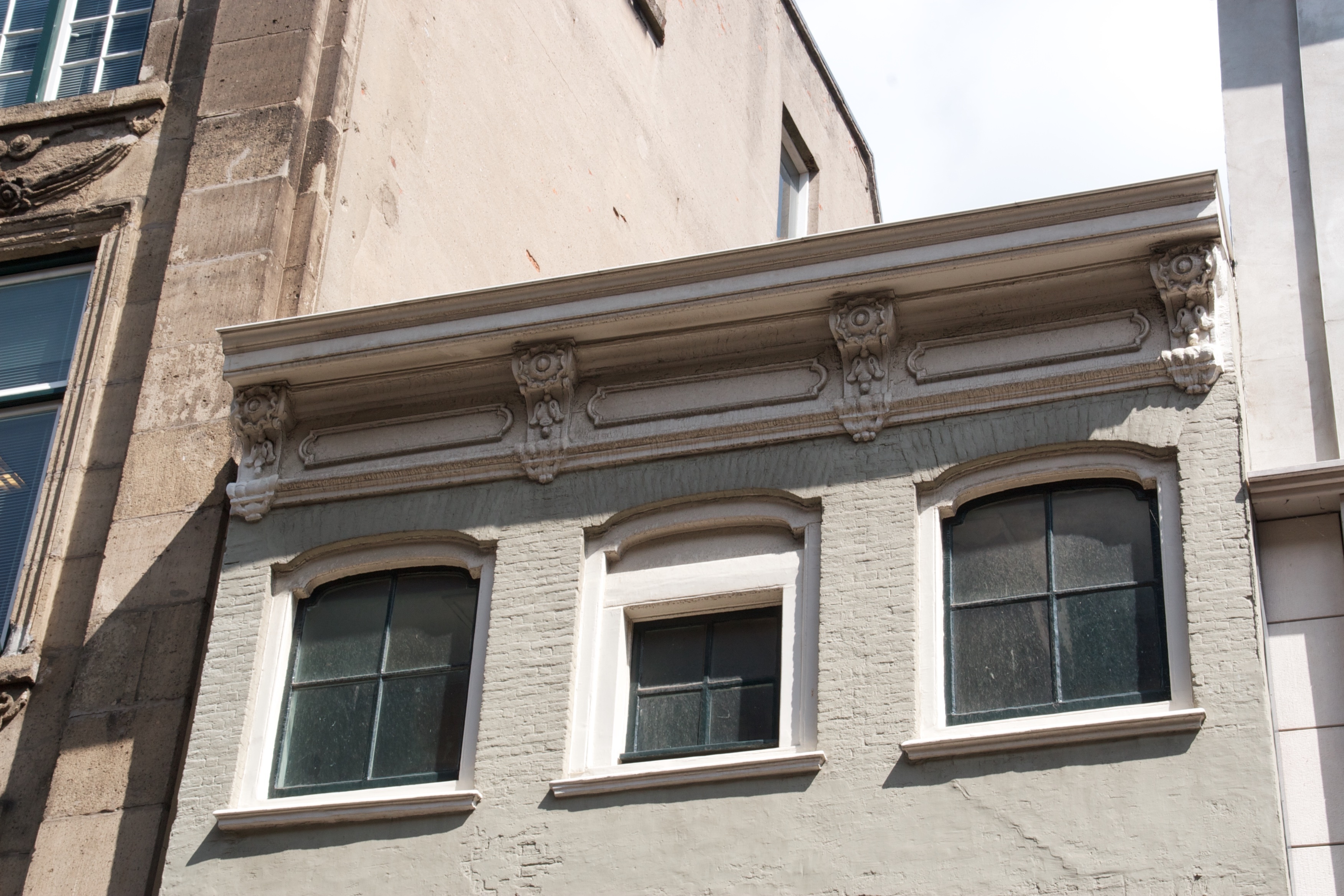 De voorgevel is een op vlucht gebouwde drielaagse lijstgevel uit de tweede helft van de 18de eeuw, die vrij recent grijs geschilderd is. De verdiepingshoogte neemt in de gevel naar boven toe af. De gevel wordt afgesloten door een recht hoofdgestel met vier rijk gesneden Lodewijk XIV-consoles in het van spiegellijsten voorziene fries. Alle kozijnen bezitten bovendorpels met schouderbogen en dateren uit de bouwtijd. De raamindeling is van een latere periode. De rijke detaillering van de kozijnen en de kroonlijst duiden erop dat dit in de achttiende eeuw een voornaam woonhuis moet zijn geweest. In de tweede helft van de negentiende eeuw heeft het zijn huidige winkelfunctie gekregen. In 1888 werd een nieuwe winkelpui aangebracht die voor een belangrijk deel nog bewaard is gebleven.