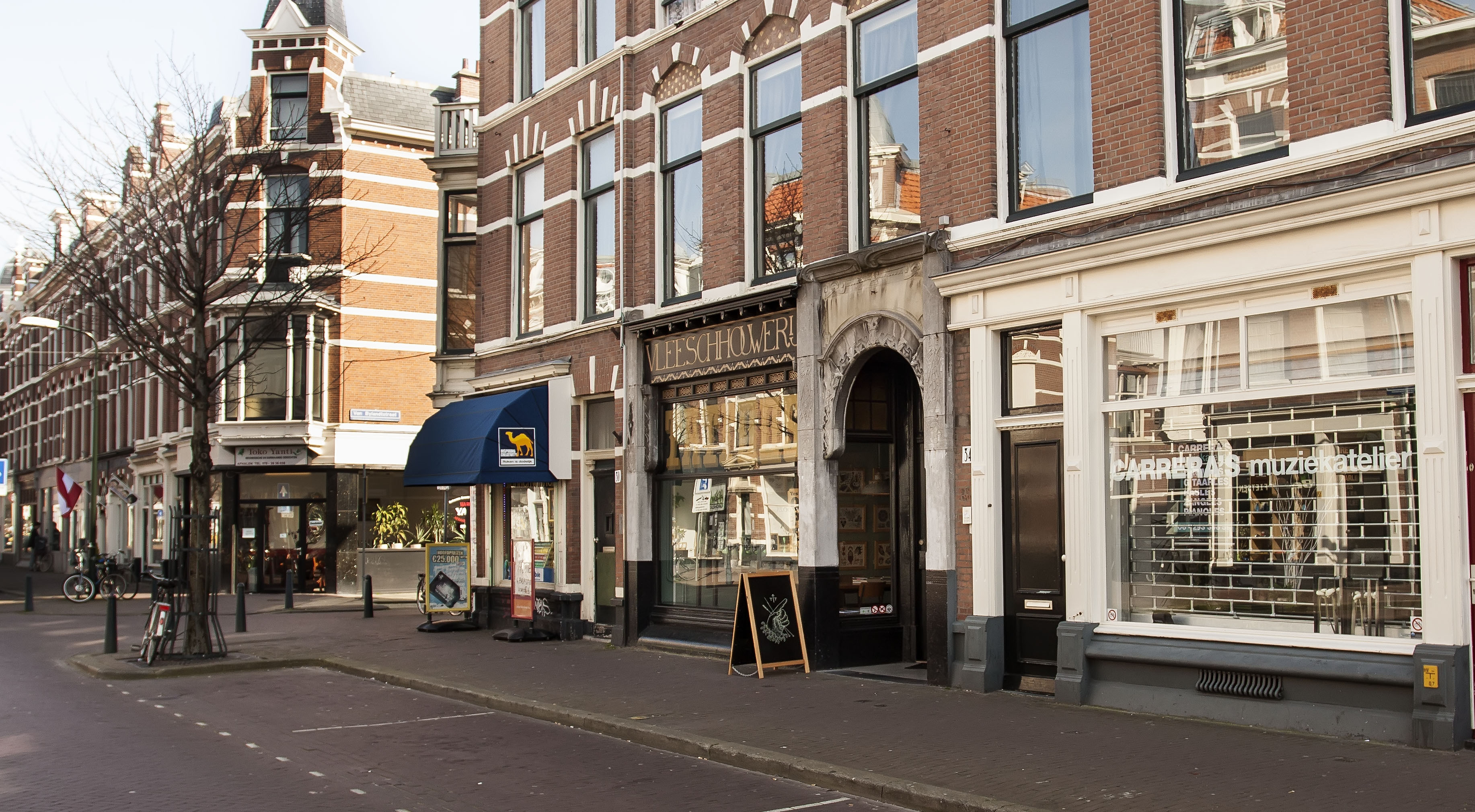 Het pand in neo-renaissancestijl is rond 1900 oorspronkelijk als woonhuis gebouwd. De benedenpui van dit woonhuis is een mooi voorbeeld van het transformatieproces van woning naar winkel. In 1919 liet slager P. van der Gugten de woning tot slagerswinkel verbouwen. De woonhuispui op de begane grond werd vervangen door een nieuwe pui met een breed etalageraam tussen twee natuurstenen stijlen en een nieuw entreepartij. De stijl van deze pui met de Javaans aandoende versieringen is in de historiserende Um-1800 en verwant aan die van warenhuis Maison de Bonneterie (Gravenstraat 2). Boven het raam is in het fries van de kroonlijst ‘vleeschhouwerij’ te lezen. Het fries is extra breed om voldoende ruimte te bieden aan de letters. De naam van de slager was oorspronkelijk op een natuurstenen plaat vermeld, omgeven door sierlijk gebeeldhouwde krullen.