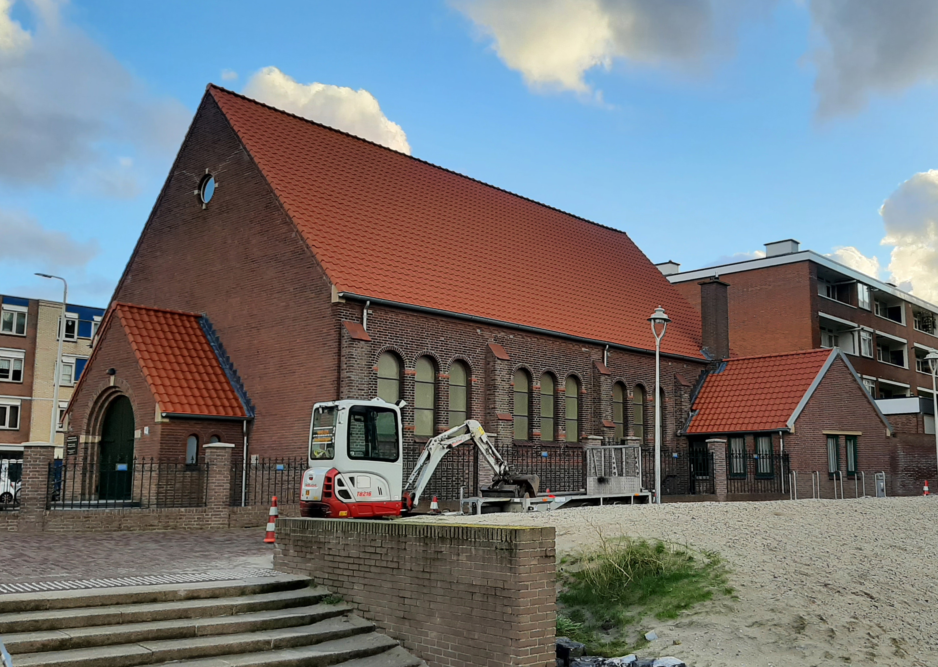 Het open plaatsje aan de achterzijde van de kerk is ommuurd door bakstenen muren.