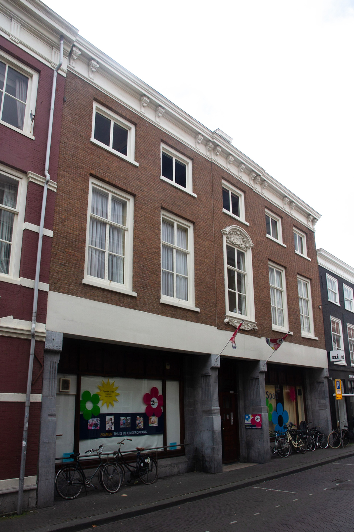Pand met Lodewijk XIV gevel met rechte kroonlijst op gesneden consoles, versierd middenvenster, onderpui ingrijpend gewijzigd.