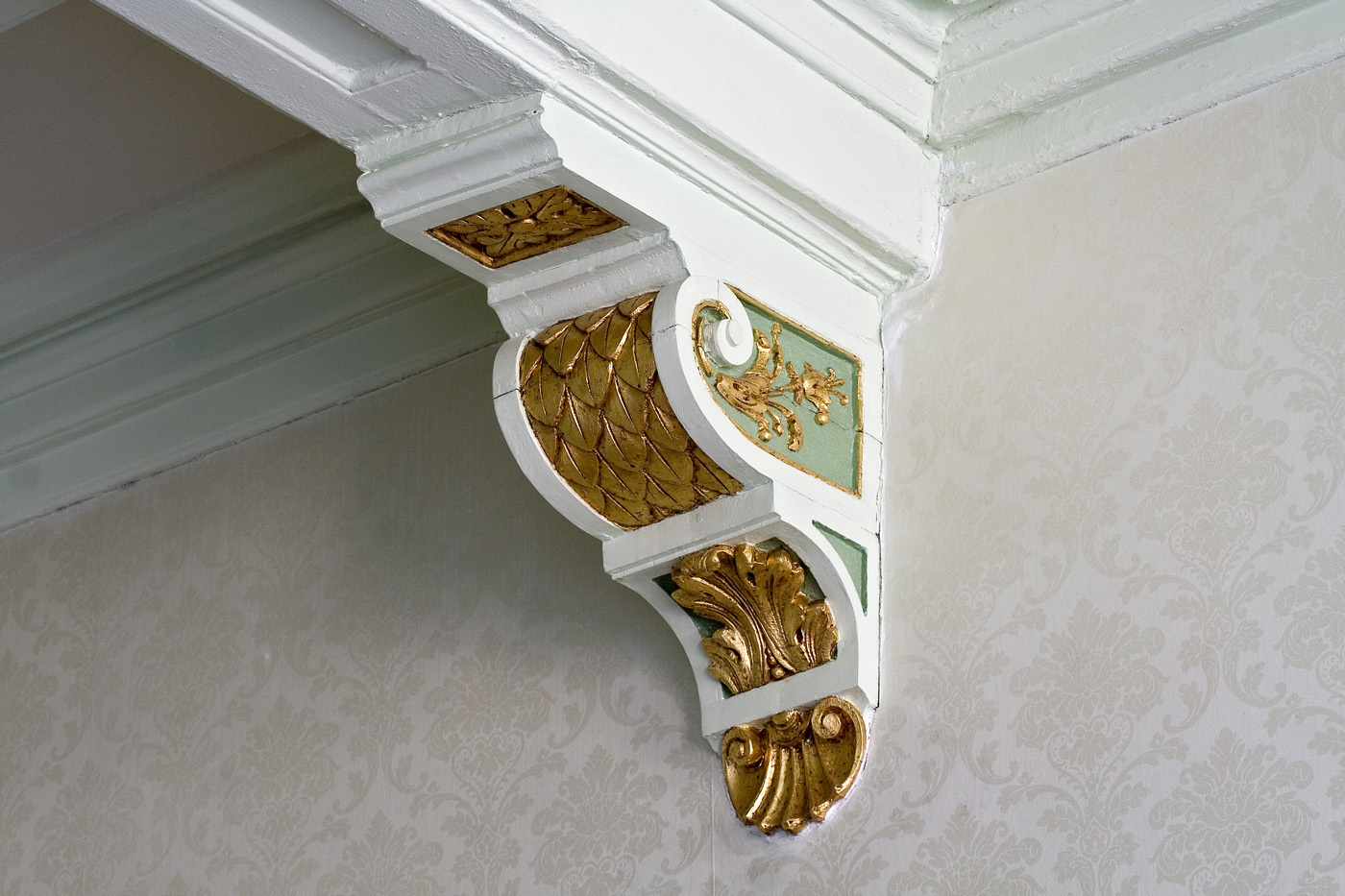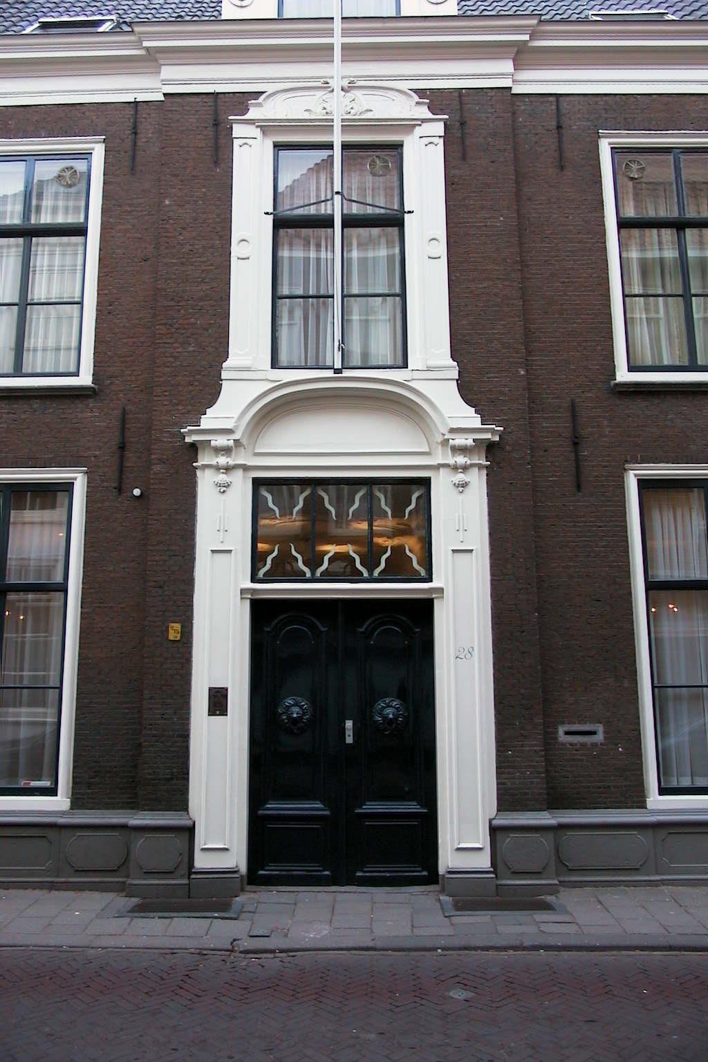 Pand met rijke Lodewijk XIV gevel met versierde middentravee op hardstenen plint - inwendig stucdecoraties uit de bouwtijd.