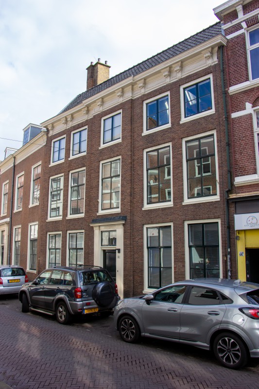 Pand met Lodewijk XIV gevel met rechte kroonlijst op gesneden consoles, ingangspartij met pilasterstelling.