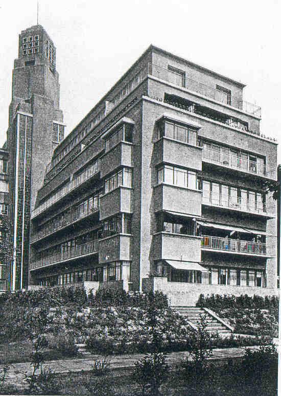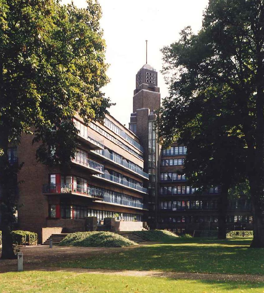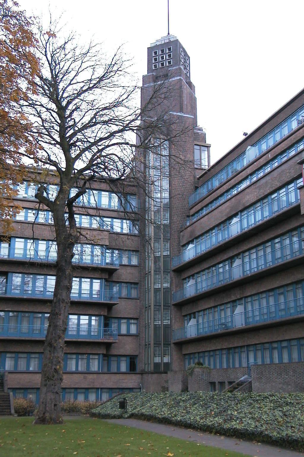 In de expressionistisch vormgegeven toren op de hoek van de twee vleugels was oorspronkelijk een aanvullend waterreservoir ondergebracht. De bakstenen toren is uit kwadranten opgebouwd, die gedeeltelijk overhoeks geplaatst zijn. De bovenste geleding van de toren heeft een decoratie met gesinterd aardewerk; de afdekking is bekleed met roodkoper. Glas-in-lood is te vinden in de verticale vensterpartijen. Op de parterre van de toren is de hoofdentree gesitueerd. Hierachter bevindt zich de centrale hal met het trappehuis dat met mozaïek is verfraaid. De oorspronkelijke indeling van de appartementen was fexibel; toekomstige bewoners bepaalden zelf in hoge mate de indeling van de luxueuze appartementen. Deze varieerden in grootte en aantallen kamers. De inrichting van de appartementen was functioneel en herinnerde aan de De Stijl-beweging. In 1959 is de flat in gebruik genomen als Ministerie van Sociale Zaken waarvoor de oorspronkelijke interieurs ingrijpend werden gewijzigd.