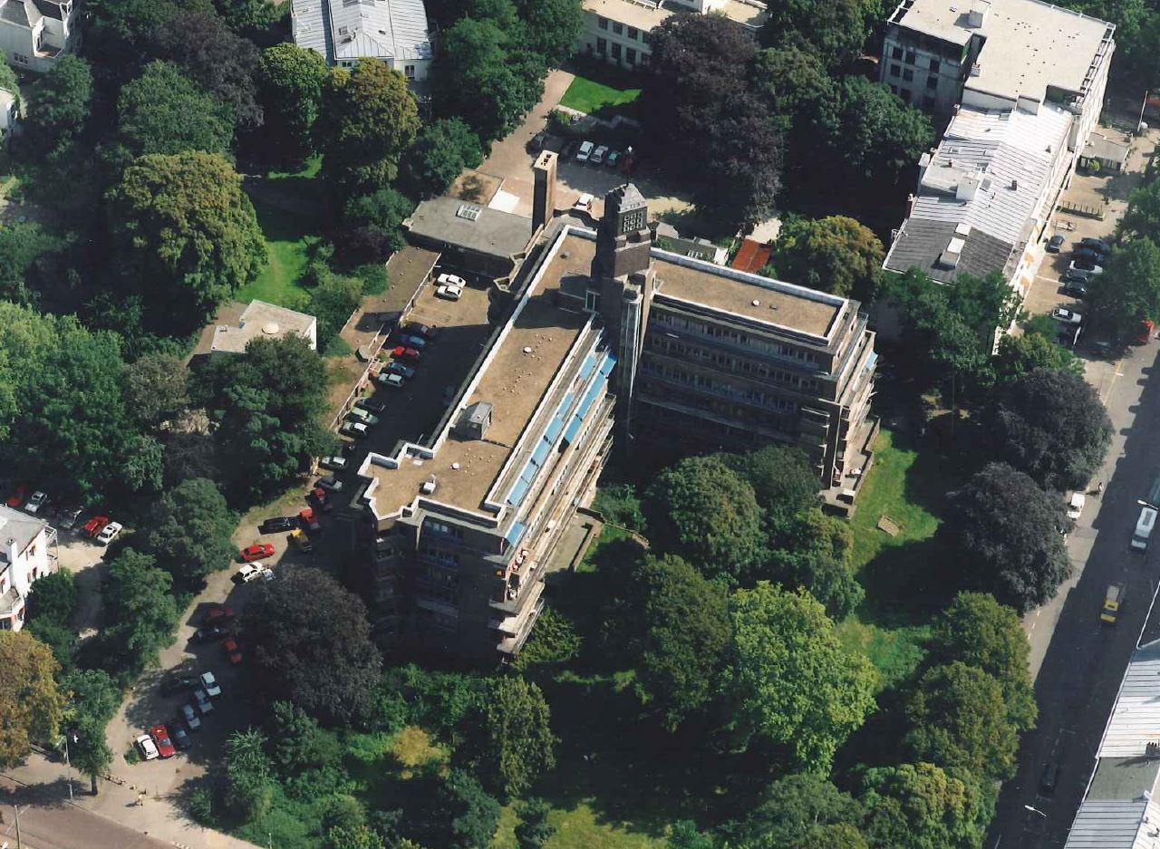 Rondom het aan de rand van het villapark Willemspark gelegen flatgebouw is een fraaie tuinaanleg met oud geboomte.