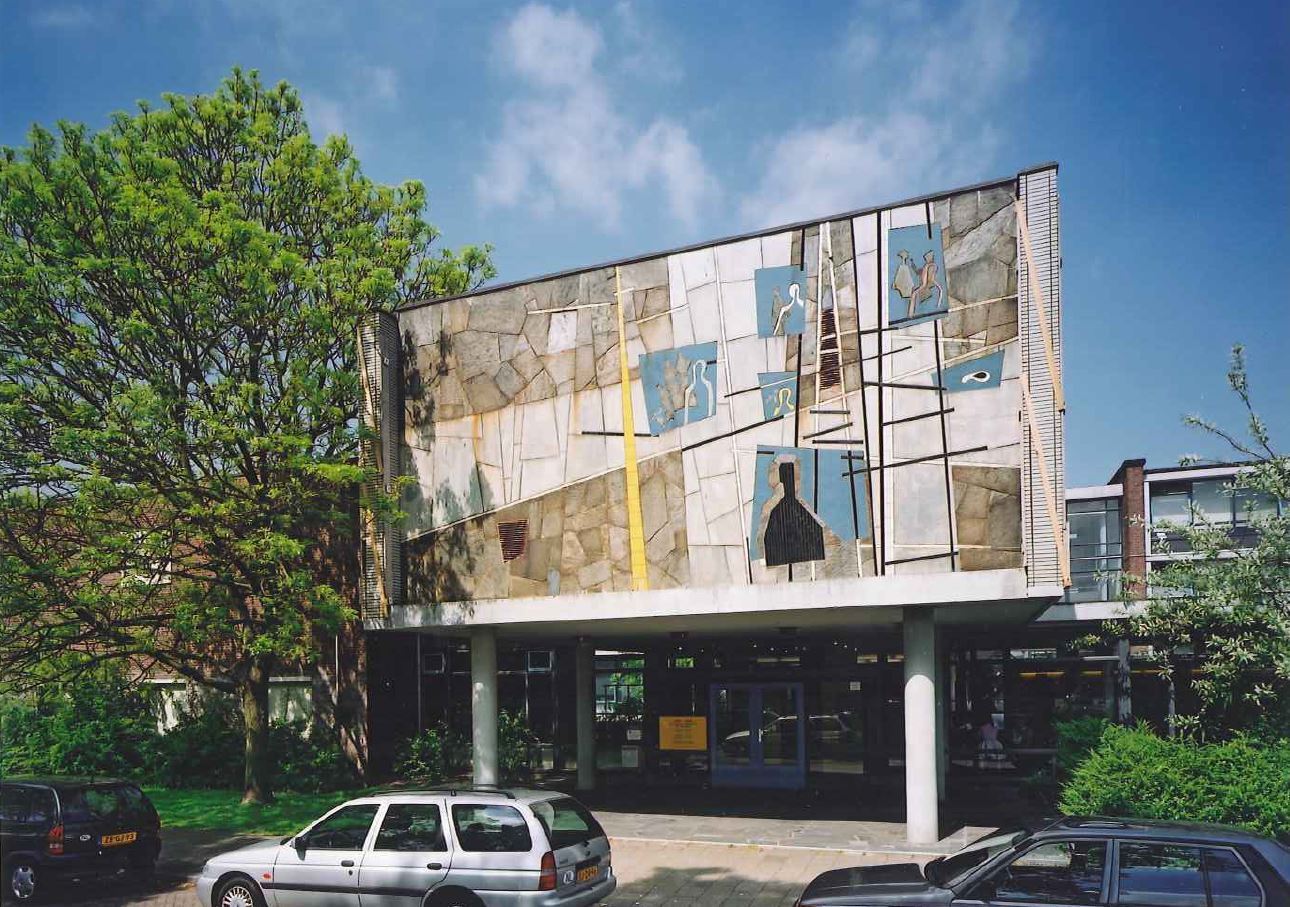 Kenmerkend voor wederopbouwarchitectuur van openbare gebouwen is de integratie met beeldende kunst. Ook bij deze school zijn meerdere kunstenaars betrokken geweest. Jeroen Voskuyl ontwierp de natuurstenen vloer van de hal en de kantine. De brede, doorlopende voegen in de onregelmatig gevormde stukken kwartsiet symboliseren de verkeersrichtingen in de school. Ook is Voskuyl verantwoordelijk voor de mozaïek op de voorgevel. De voorstelling symboliseert de maatschappelijke ladder en de relatie tussen school, leerling en ouders. Willem Hussum bracht een schildering aan op de scheidingswand tussen hal en docentenkamer op de eerste verdieping. Het is een compositie met geometrische figuren in vrolijke kleuren. Een krant schreef over Hussums kunstwerk: “Waar vroeger in soms sobere schoolgangen de platen hingen van ‘De kruisvaarders veroveren Damiante’, is hier een lichte, vrolijke hal gemaakt.” Jan Snoeck ontwierp buiten het gebouw het inlaatrooster van de luchtverversing. Oorspronkelijk stond het op het schoolplein, nu bij de voormalige hoofdingang.