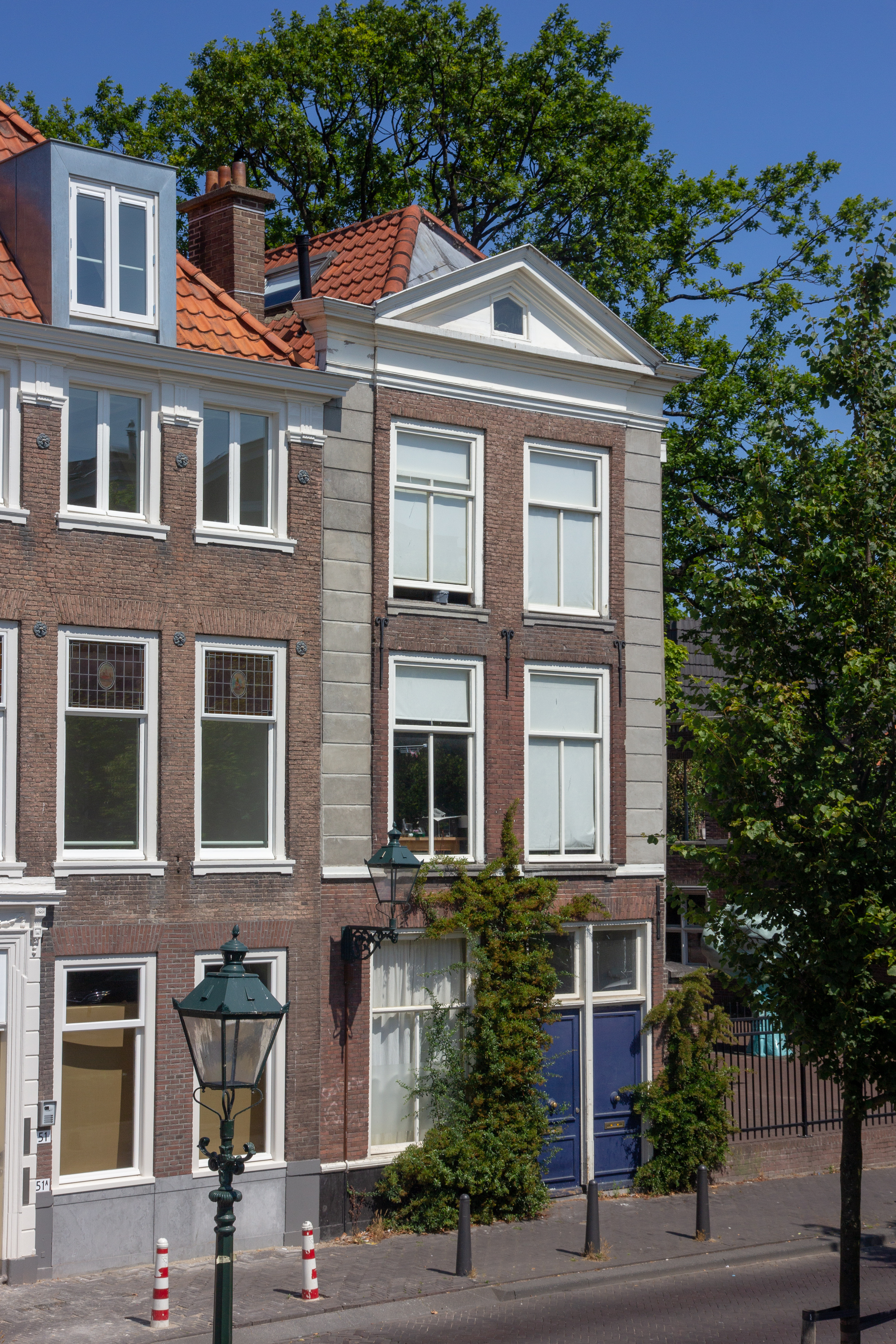 Pand uit de 18de eeuw met zadeldak en lager achterhuis. Twee venster- assen breed, bestaande uit parterre en twee verdiepingen. Voorgevel met houten kroonlijst en geblokte hardstenen lisenen aan de zijkanten. Boven de kroonlijst een houten fronton. De gevel bezit twee deuren met panelen. Onder de vensters geprofileerde hardstenen dorpels, 18de eeuw. Drie sierankers.
