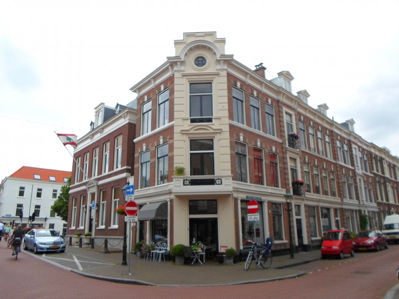 Op de begane grond bevinden zich drie authentieke winkelpuien (twee in de Prinses Mariestraat en een in de Frederikstraat). Deze worden omlijst door pilasters en hebben een gesneden touwornament. De hardstenen plint heeft een geprofileerde lijst De gevels zijn uitgevoerd in schoon metselwerk met gekleurde bakstenen sierbanden. De strekken boven de verdiepingsvensters bezitten geprononceerde sluitstenen.