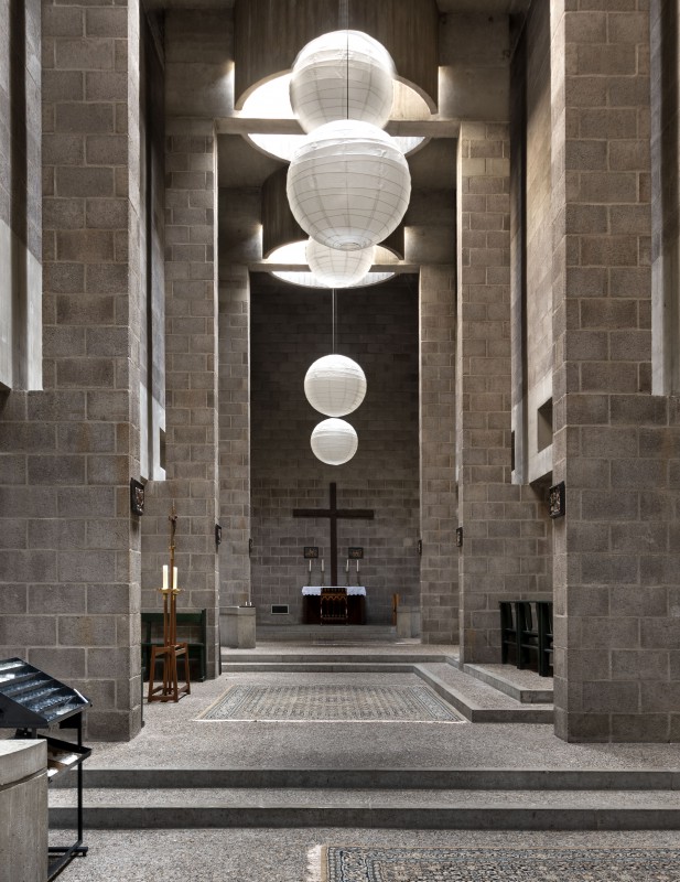 Het licht uit de betonnen cilinders met een diameter van 3,5 meter en een hoogte van 2,5 meter wordt gelijkmatig verspreid in de ruimte. In de verhoogde middenzone zijn vier kleinere lichtkoepels opgenomen. De cilinders zijn in het hart van de betonnen constructiebalken gesitueerd. De middenzone wordt gedomineerd door hoog oprijzende, uit de muur ontspringende betonstenen portalen, die de zware 1,5 meter hoge betonnen met gleuven geperforeerde dwarsbalken dragen.