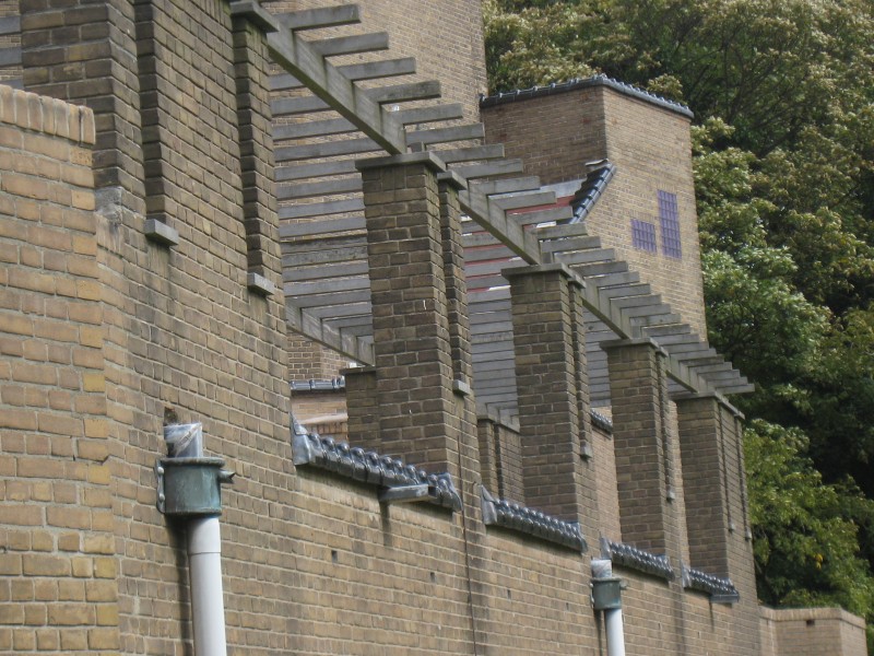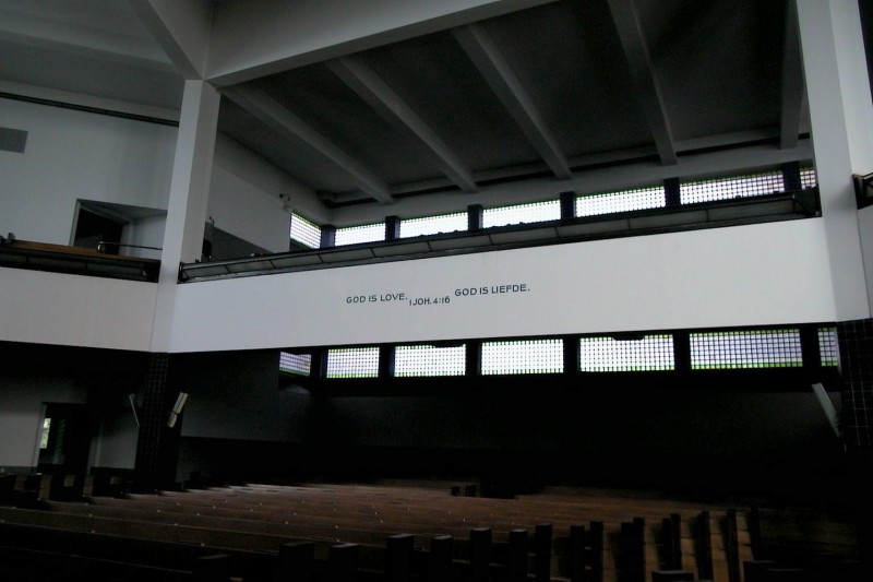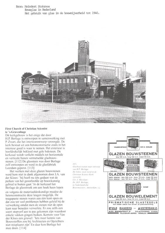 Complex van de First Church of Christ, Scientist. Op verschillende niveau's gesitueerd COMPLEX VAN GEBOUWEN, gegroepeerd rondom de op waaiervormige plattegrond ontworpen kerk, met toren aan de kortste zijde, te linkerzijde de kosterswoning, te rechterzijde de zondagsschool en daartussen in de bestuurskamer en de ingangspoort, gebouwd 1925-27 naar ontwerp van H.P. Berlage, met medewerking van Piet Zwart (interieur).