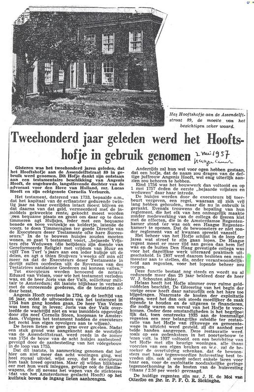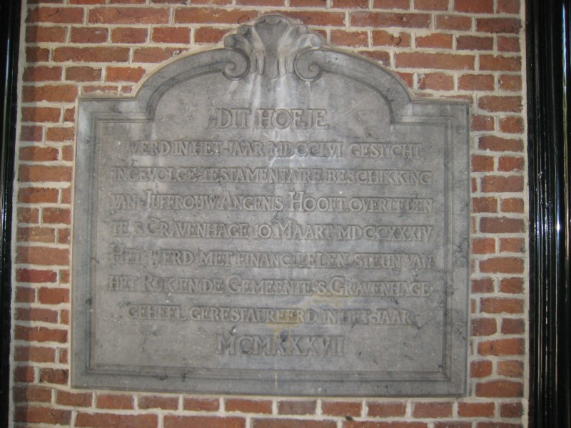 De stichting van het hofje van juffrouw Angenis Hooft is in meerdere opzichten bijzonder. Angenis Hooft overleed in 1734, maar pas in 1754 werden een huis en een stuk grond gekocht aan de westzijde van de Assendelftstraat. Angenis had namelijk bepaald dat de executeurs gedurende twintig jaar haar nagelaten kapitaal en goederen door rente en inkomsten moesten vermeerderen om vervolgens van dat bedrag een hofje te stichten. Het hofje was bestemd voor 'bejaarde vrijsters ofte weduwen, die belijdenis sijn doende van de Gereformeerde Religie'. De dames woonden gratis en kregen vijf tonnen turf per jaar, en acht tot tien stuivers per week.