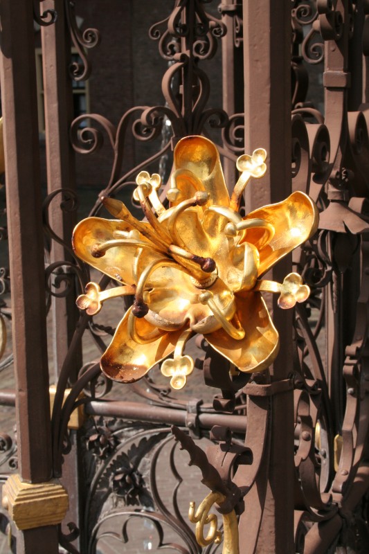 De armen zijn afwisselend van draadvormige spuwers voorzien, bij de eerste geleding als volledige dierfiguren, bij de tweede geleding alleen als koppen; voorts vier wapenschilden door helmen bekroond (beurtelings met de Hollandse leeuw of de Duitse adelaar), die een Latijns randschrift rondom telkens onderbreken.