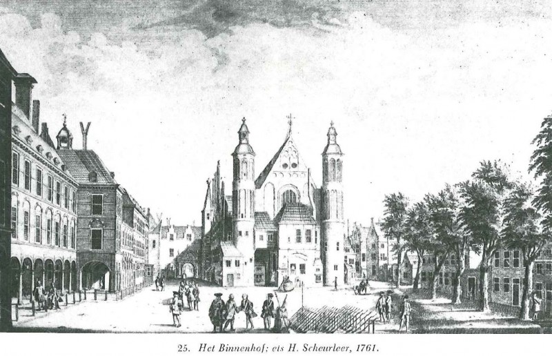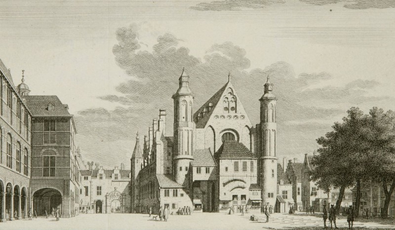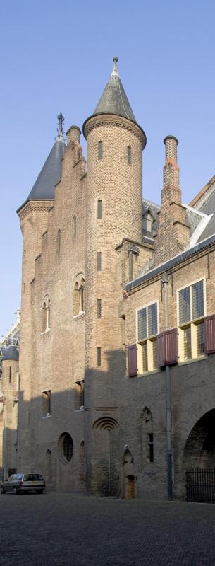 VOORMALIG PALEIS DER GRAVEN VAN HOLLAND MET RIDDERZAAL; het oudste deel van omstreeks 1250 bevat nog een kelder uit de bouwtijd en daarboven de Rolzaal; de oostelijke aanbouw, eertijds de Civiele kamer van het Hof van Holland, dateert in zijn huidige toestand uit 1668, toen ook de zeven wandschilderingen op doek door Gerard de Lairesse werden aangebracht; de Ridderzaal uit de tweede helft van de 13e eeuw bevat in de kelder nog resten van een ouder gebouw.