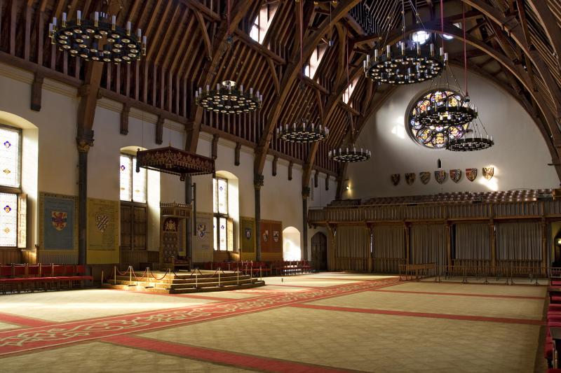 Wie nu de Ridderzaal binnenkomt ziet een indrukwekkende houten kap en een enorme schouw; bij uitstek die onderdelen van een interieur die onmiddellijk associaties met de middeleeuwen oproepen. Het tovert een romantisch beeld voor ogen van stoere ridders die zich aan lange tafels tegoed doen aan een rijke dis, terwijl een haardvuur hoog opvlamt en schaduwen werpt op de houten balken van de kap. Schijn bedriegt; het uiterlijk van de zaal is het resultaat van een verbouwing uit 1901. De originele middeleeuwse kap was tot 1861 nog aanwezig. In dat jaar nam de Tweede Kamer het besluit om de kap van de Grote Zaal te herstellen volgens de plannen van rijksbouwmeester W.N. Rose. Rose veronderstelde dat de aanwezige houten kap niet uit de middeleeuwen kon stammen omdat hij op een sleutelstuk het jaartal 1631 had aangetroffen, en verving deze door een eigentijdse neogotische kap van gietijzer op twee rijen kolommen. Zonder twijfel zou de gietijzeren kap vandaag de dag architectonisch hoog gewaardeerd worden, maar toen riep de vervanging heel wat negatieve reacties op. Discussies waren er ook over de bestemming van het gebouw; daar is men in de negentiende eeuw eigenlijk niet uitgekomen. Tot 1878 stond het leeg en toen werd het bestemd als depot voor het Oud-Archief van Binnenlandse Zaken. De zaal werd geleidelijk volgezet met archiefstellingen, 'feitelijk weinig meer dan een rommelmagazijn'. Pas in 1894 volgde het begin van eerherstel met de vorming van een commissie op initiatief van rijksbouwmeester C.H. Peters. Dit leidde in 1896 tot een Commissie van Advies waar behalve Peters ook architect P.J.H. (Pierre) Cuypers toe behoorde. Cuypers, een groot kenner van de middeleeuwse gotiek, was een autoriteit op het gebied van restauraties van middeleeuwse gebouwen. Van Cuypers hand is de nieuwe inrichting van de Ridderzaal, inclusief de troon. Men besloot de ingreep van Rose weer ongedaan te maken en de houten kap naar oud model weer terug te brengen. Hiervoor leverde rijksbouwmeester Peters het ontwerp die zich daarbij baseerde op de aantekeningen en opmetingen tijdens de afbraak van de originele houten kap. Verdeelde de gietijzeren kap op kolommen de zaal in drie beuken, nu rusten de houten kapspanten op stenen consoles, waardoor de oorspronkelijke ononderbroken ruimte weer in ere is hersteld. Ook de grote schouw aan één van de korte wanden is het resultaat van een reconstructie, dit keer op basis van historische afbeeldingen van de zaal. In de lange wanden plaatste men natuurstenen kruiskozijnen met eikenhout betimmerd en voorzien van glas-in-lood. De houten lambrisering daaronder is versierd met kleine beeldhouwwerkjes, sommige in de vorm van middeleeuwse 'monstertjes'. De Ridderzaal kreeg in 1904 haar definitieve bestemming als troonzaal, waar op de derde dinsdag in september de koningin de troonrede voorleest tijdens de opening van het parlementaire jaar en waar de presentatie van de rijksbegroting plaatsvindt. Daarvoor vonden deze gebeurtenissen plaats in de vergaderzaal van de Tweede Kamer aan het Binnenhof. Op 6 september 2006 werd aan de koninklijke familie en andere genodigden het resultaat getoond van de dan net gerealiseerde vernieuwing van de Ridderzaal. Wat sfeer en kleurstelling betreft is de zaal weer teruggebracht in de staat van 1904. In de loop van de decennia was er al weer veel veranderd. Met name de witte muren gaven de zaal een harde uitstraling. Achter de Grote Zaal lag het woongebouw met de grafelijke woonvertrekken, waartoe de Rolzaal en de De Lairessezaal behoren. Dankzij de bemoeienissen van de Commissie van Advies heeft ook de Rolzaal aan het eind van de negentiende eeuw een uitgesproken middeleeuwse sfeer gekregen. Deze zaal heeft twee schouwen, een sobere zandstenen schouw en een schouw met een zware gotische kroonlijst. Het plafond van moer- en kinderbinten steunt op sleutelstukken met daaronder een fraai gebogen korbeel. Onder de korbelen zijn als extra steun consoles geplaatst. Vier daarvan, het dichtst bij de schouw met de gotische lijst, zijn van steen en nog origineel dertiende-eeuws. In hun verweerde uiterlijk zijn kleine tafereeltjes uitgesneden. Door de inpandige ligging is deze zaal vrij donker: gefilterd daglicht valt binnen via de houten kruiskozijnen met glas-in-lood en voor kunstlicht zorgen de twee bijzonder stijlvolle kronen, een ontwerp van Cuypers. In de De Lairessezaal die aan het uitende van het complex ligt, handhaafde de Commissie bij gebrek aan voldoende gegevens voor een reconstructie, het interieur met de zeventiende-eeuwse schilderingen van Gerard de Lairesse, zij het met enige tegenzin.