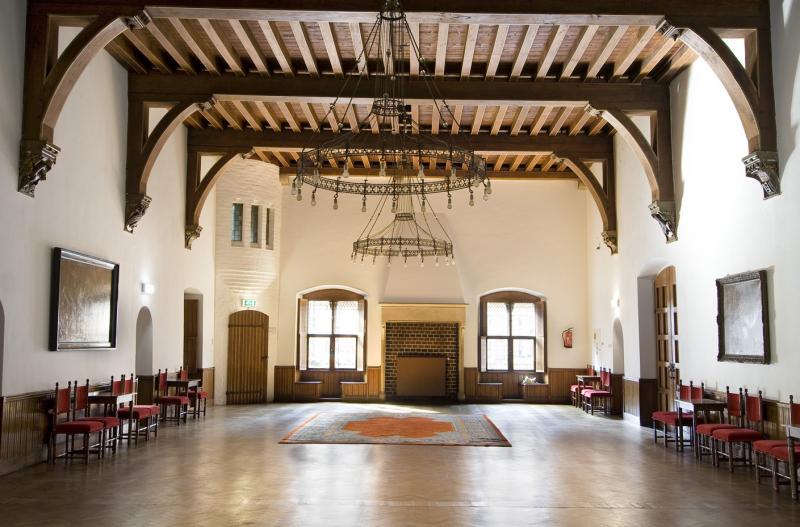 Groot zaalgebouw, dat in zijn huidige omvang grotendeels in opdracht van graaf Willem II en Floris V in de 2e helft v.d. 13e eeuw is opgetrokken. In de 1e helft van de 14 e eeuw werd achter het rolgebouw nog een nagenoeg vierkante vleugel aangebouwd. De ridderzaal, zoals dit complex in de 2e helft van de 19e eeuw werd genoemd, is in de loop van de eeuwen vele malen verbouwd. Het portaal voor de hoofdingang en torenspitsen dateren uit ca. 1880. Rond de eeuwwisseling is het gebouw grondig gerestaureerd en gerenoveerd in deels pseudo-gotische trant. Toen zijn ook allerlei lagere bouwsels die tegen de zaal waren aangebouwd verwijderd.