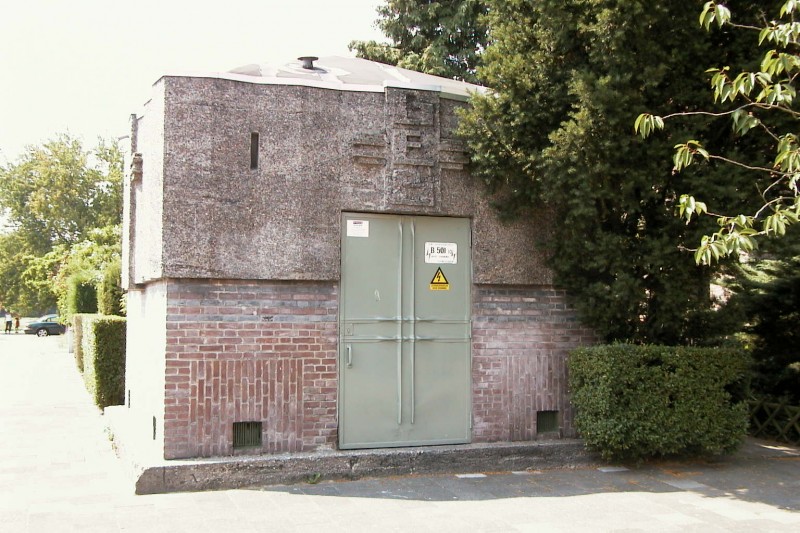 In baksteen en grintbeton opgetrokken transformatorhuis op vierkante plattegrond uit 1924 naar ontwerp van architect J.J. Hellendoorn.