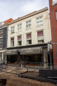 Het pand heeft een met pannen gedekt schilddak. De voorgevel telt vier vensterassen en is boven de winkelpui uitgevoerd in schoonmetselwerk dat nadien geschilderd is. De kozijnen zijn voorzien van schuiframen, waarbij die van de zolderverdieping een empire-indeling hebben.