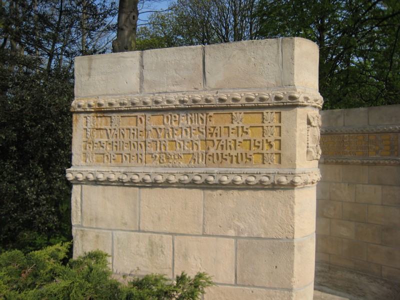 Gedenkmonument in historiserende vormentaal naar ontwerp van beeldend kunstenaar Willem Brouwer in de vorm van een zitbank met fontein uit 1915 ter herinnering aan de Carnegiestichting en de oprichting van het Vredespaleis in 1913, en genoemd naar Jonkheer Mr. A.P.C. van Karnebeek (1836-1925), destijds voorzitter van de Stichting. Willem Brouwer was directeur van de N.V. Fabriek van Brouwers aardewerk te Leiderdorp, die ook de materialen voor het gedenkmonument leverde.