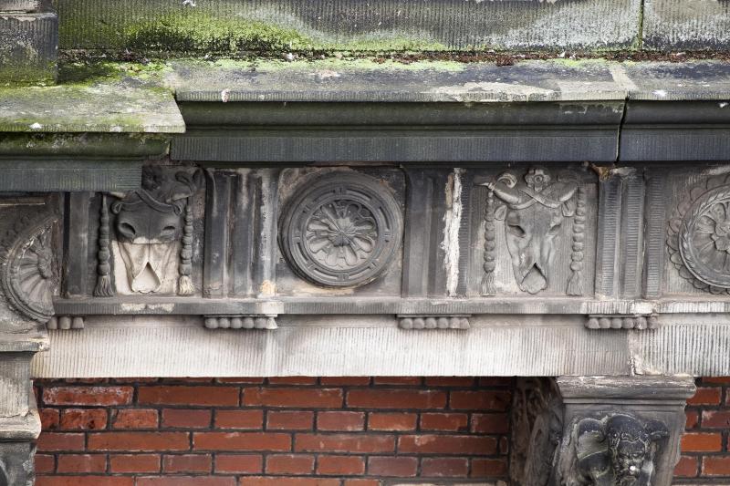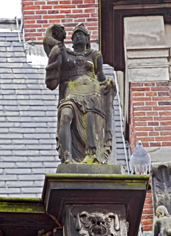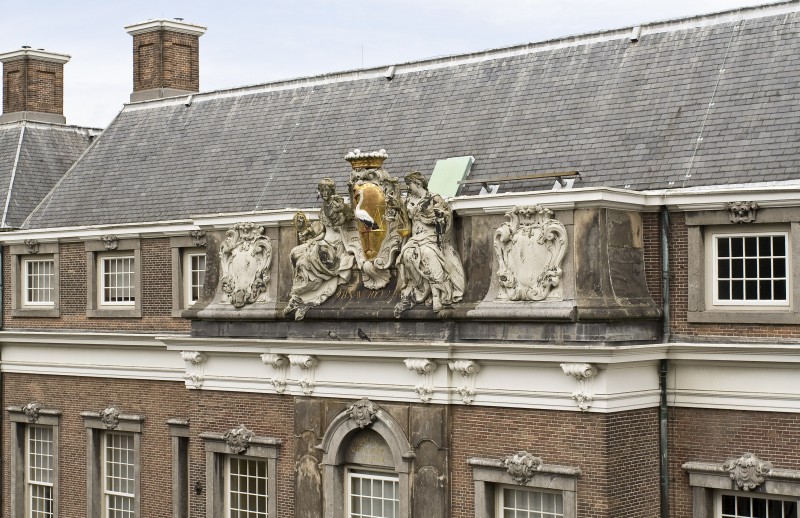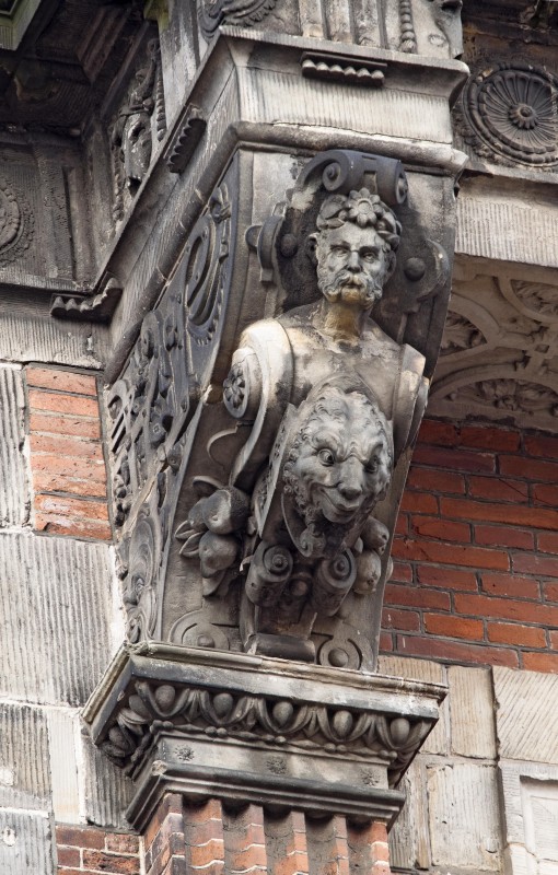 Interieur: De oudste interieurs zijn eenvoudiger dan de uitbundig beschilderde en gedecoreerde wanden en stucplafonds van de monumentale gang en de kamers van het achttiende-eeuwse deel. Hier wordt alleen het oudste gedeelte behandeld.Tot dit deel behoort de Schepenzaal of Vierschaar met nog twee kamers. Uit deze tijd, de zestiende eeuw, is niet veel bewaard origineels in het interieur bewaard gebleven. Waarschijnlijk zijn alleen de natuurstenen consoles onder de zware moerbalken nog oorspronkelijk. De consoles bestaan uit twee boven elkaar geplaatste stukken, die aan de voorzijde versierd zijn met een wapenschild en de kop van een leeuw, vrouw of engel. Aan de zijkanten heeft de maker zich uitgeleefd met zogenaamde grotesken, fantasiefiguurtjes in soms bizarre vormen.