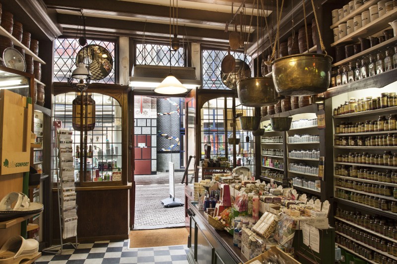 Smal hoog huis, waarschijnlijk uit het midden van de 16e eeuw met een lijstgevel uit 1796, bestaande uit twee vensterassen en drie verdiepingen boven de 19de eeuwse winkelpui. Deze heeft geprofileerde pilasters en puibalk. De vensters van de bovenste verdieping lopen door in de kroonlijst. De drogisterij bezit een volkomen gaaf l9de eeuws winkelinterieur; het balkenplafond is ouder, terwijl de rijk gesneden trap in Lodewijk XV-stijl is uitgevoerd.