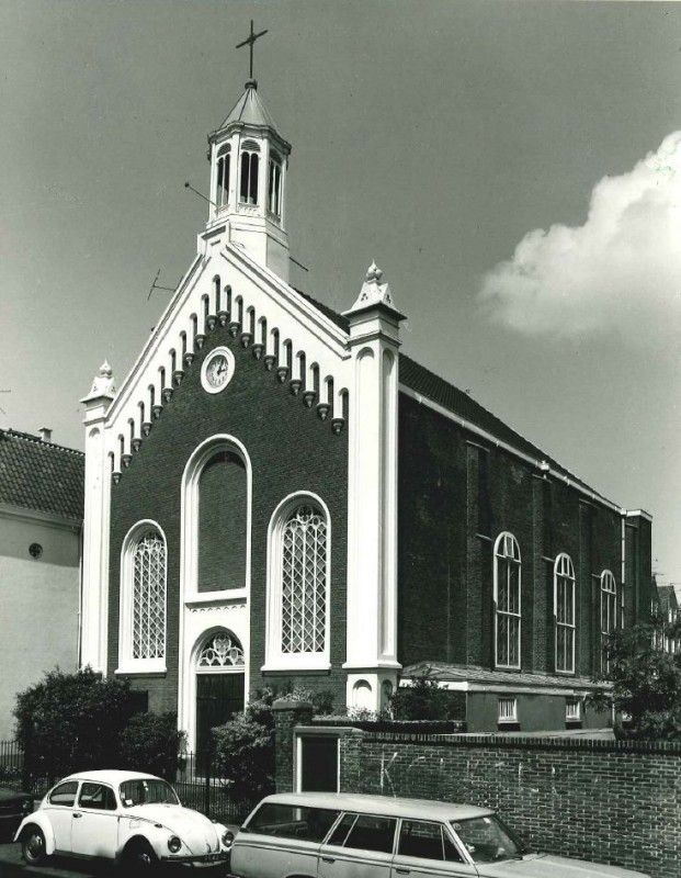 Bakstenen zaalkerk in eclectische, overwegend op neo-romaans geinspireerde stijl, drie vensterassen breed en vier traveeën diep. Aan de achterzijde is een vijfzijdige koorpartij. De voorgevel, met daarvoor een erf en een eclectisch hekwerk dat uit het derde kwart van de 20e eeuw stamt, is een door gepleisterde hoeklisenen geflankeerde puntgevel met klimmend boogfries en rondboogvensters. In het midden van de gevel op de begane grond de hoofdingang met dubbele paneeldeur waarboven resp. een rondboogvenster met drie- en vierpassen, bepleisterde zwikken, een blindnis opgevuld met bakstenen en tenslotte in een tondo, een klok. Zijdelings van de ingang ter hoogte van het kalf van de deur, twee rondboogvensters; bij de aanzet van de boog zijn resp. drie - en vierpassen. Als gevelbeeindiging een houten achthoekig klokketorentje met spits. De zijgevel aan de oostzijde heeft vier traveeen en een uitgebouwde sacristievleugel. Deze worden door steunberen gescheiden. De eerste travee heeft geen venster; de overige wel. De onderdorpels van de vensters rusten op een zinken roevendak van de acolyten-, priester- en bisschopsacristie die evenwijdig aan de oostgevel loopt. In de gevels zijn hoge rondboogvensters met gietijzeren tracering en ruitvormige glazen met blauw en wit als hoofdkleur. Het interieur waarvan de huidige kleurstelling dateert uit de jaren veertig van deze eeuw, wordt overdekt door vlakke, achtdelige ribgewelven van gestucadoord hout. De vijfzijdige koorpartij heeft een straalgewelf. De open balustraden van de orgelgalerij met convex beloop tegen de westzijde zijn het resultaat van een verbouwing uit de jaren twintig van deze eeuw. De kerkinventaris, deels authentiek, is overwegend in neo-romaanse stijl uitgevoerd en omvat ondermeer altaar, kniel-, priester- en zitbanken, kandelaar, lessenaar, preekstoel, offerblok, doop- en wijwatervont. Het orgel is vervaardigd door de firma Van Leeuwen, afkomstig uit Leiderdorp en is niet van waarde uit het oogpunt van monumentenzorg. De orgelkas, gemaakt door J. van Gelder in 1891, is van waarde uit het oogpunt van monumentenzorg.