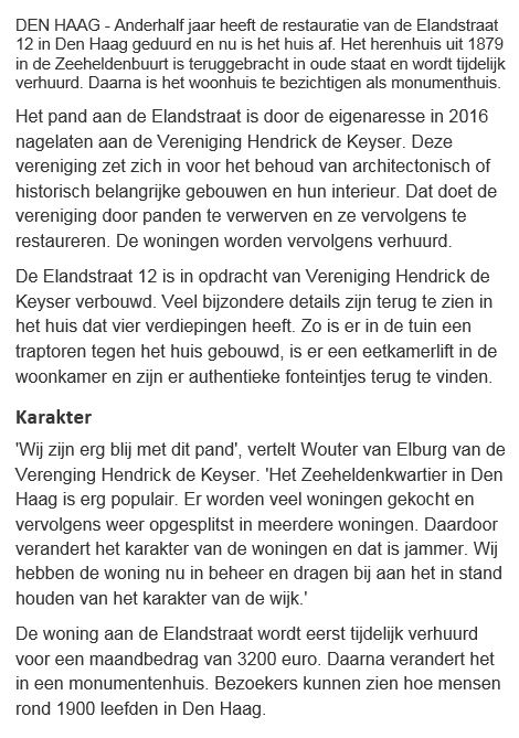 Elandstraat 12 is van architectuurhistorische waarde als goed voorbeeld van de overgangsarchitectuur en vanwege het bijzonder gaaf bewaarde art nouveau-interieur. De traptoren op ijzeren kolommen is een uniek element in Den Haag. Het is van cultuurhistorische waarde omdat het een compleet beeld geeft van de Haagse wooncultuur anno begin 20ste eeuw.