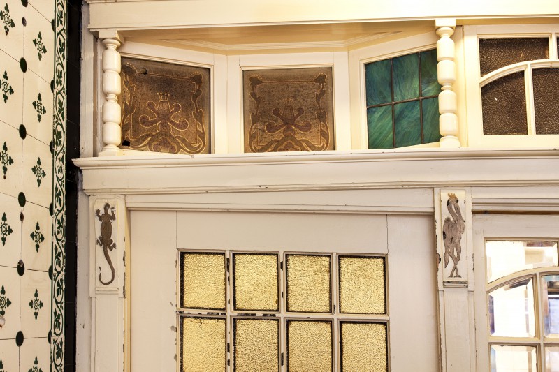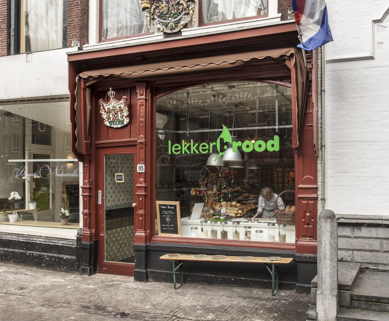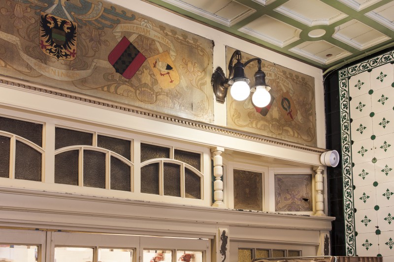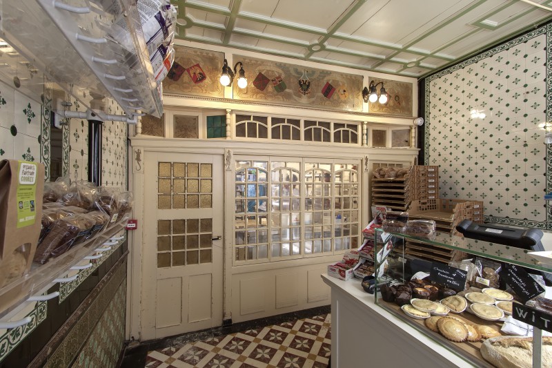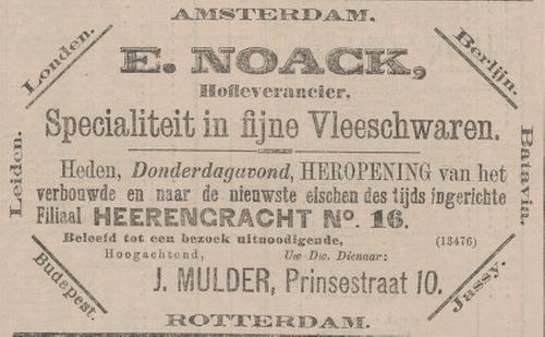De winkel behoorde aan E. Noack, een delicatessenwinkel in ‘fijne vleeschwaren’. De destijds vermaarde vleesfabriek van Noack was gevestigd in Groningen en had filialen in binnen- en buitenland, waaronder meerdere in Den Haag. Het winkelinterieur is nog grotendeels intact, inclusief vleeshaken; alleen de vloer, de toonbank en de etalage-inrichting zijn vernieuwd. Vanwege de oorspronkelijke functie als vleeswarenwinkel zijn de wanden met geglazuurde tegels bedekt. Het vroegere kantoorgedeelte achterin wordt van de winkel gescheiden door een rijk vormgegeven wand met geslepen ruitjes. In het fries erboven zijn in panelen op doek de wapens geschilderd van de steden waar Noack gevestigd was: Leiden, Rotterdam, Groningen, Amsterdam en Den Haag, geflankeerd door Berlijn en Brussel, en Londen en Batavia. Gesneden beestjes, waaronder een ooievaar, een salamander en een varkentje sieren de deurposten. Het plafond is een origineel houten cassettenplafond. De wapenschilden aan de gevel refereren aan het feit dat Noack sinds zeker 1896 hofleverancier was.