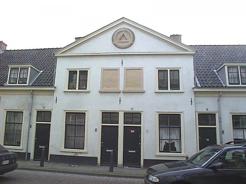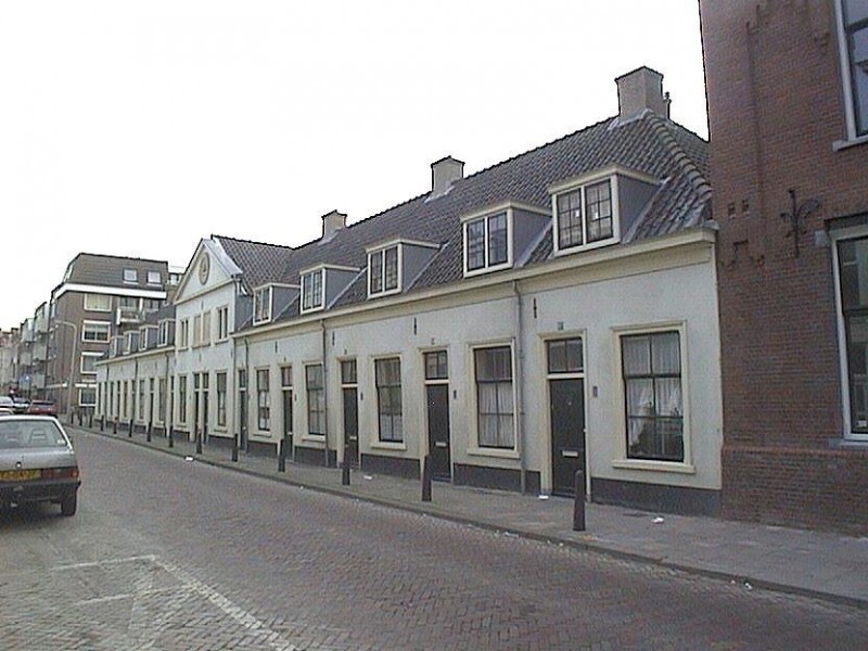 Stichting De Geefhuisjes, gebouwd in 1665 - RIJ VAN 12 HUISJES, de twee middelste verhoogd en bekroond met een driehoekig fronton