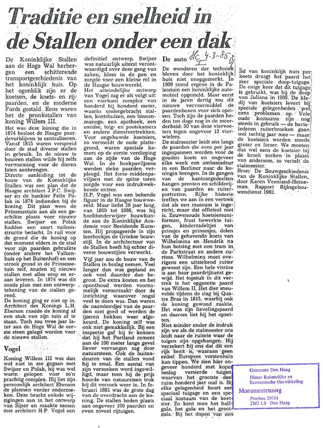 Als Koninklijke STALLEN rondom rechthoekige binnenplaats op symmetrische grondslag gebouwd, omvangrijk complex ter hoogte van twee bouwlagen onder met leien, zink en dakpannen gedekte mansardekappen, tot stand gekomen in 1876-'79 in eclectisch-Renaissancistische trant naar ontwerp van H.P. Vogel, op basis van voor-ontwerpen van L.H. Eberson, respectievelijk P.J.C. Swijser.