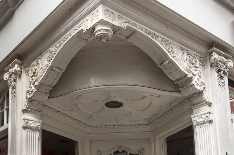 Het hoekpand bestaat uit drie bouwlagen met een afgeknot schilddak en heeft langs de Hoogstraat een in eclectische stijl uitgevoerde lijstgevel, daterend uit het derde kwart van de negentiende eeuw. Deze gevel wordt beëindigd met een geprononceerde houten kroonlijst voorzien van vier rijk gesneden consoles. Het voorste deel van het pand is mede gelet op de aanwezige rozetankers van de zijgevel in de Annastraat in de late negentiende eeuw ingrijpend verbouwd. Het bouwvolume hierachter is iets lager en plat afgedekt. Aan de onregelmatige gevelindeling en afwijkende verdiepingshoogte is te zien dat dit bouwdeel in fases tot stand is gekomen. Het is vrijwel zeker dat het achterste deel van dit langgerekte pand oorspronkelijk een zelfstandig huis betrof dat later aan Hoogstraat 18 werd toegevoegd. Het bouwdeel hiertussen is vermoedelijke zeventiende- of achttiende-eeuws van oorsprong. Gezien de ligging van het pand in één van de oudste delen van de binnenstad is het niet uitgesloten dat delen van het pand van hoge ouderdom zijn. De winkelpui in Um-1800 stijl met etalages in zowel de Hoogstraat als Annastraat werd in 1907 geplaatst. Kenmerkend voor de luxueuze Um-1800 stijl zijn de zorgvuldig vormgegeven decoraties en het gebruik van klassieke materialen. Fijnzinnig gesneden bloemranken, bladwerk en medaillons sieren de kapitelen, de bovenlichten en het lijstwerk boven de ingang. De marmeren plint is overgeschilderd.