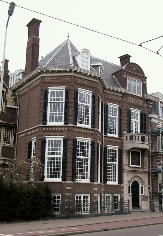 Voor het souterrain bevindt zich een smeedijzeren hek. De schuifvensters zijn in kleine roeden onderverdeeld en op debouwlagen voorzien van luiken. De kroonlijst rust op houten klossen. Het dak bevat twee dakkapellen, waarvan een met een gebogen fronton, en hoge gemetselde schoorstenen.