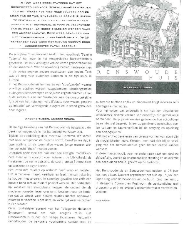 Fundatie van de Vrijvrouwe van Renswoude, gebouwd in 1921-1923 naar ontwerp van de architect A. Mondt jr. Het in 1564 gestichte Burgerweeshuis en de in 1754 uit een legaat van Maria Duyst van Voorhout, douairière van Frederik Adriaan Baron van Reede, Vrijheer van Renswoude gestichte Fundatie van de Vrijvrouwe van Renswoude, aanvankelijk aan het Westeinde gevestigd, betrokken in 1923 het huidige pand aan het Jozef Israelsplein.