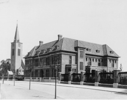 Het in baksteen opgetrokken gebouw in traditionalistische stijl bestaat uit vier vleugels van twee bouwlagen onder pannen schilddaken rond een, thans overdekte, binnenplaats. De voorgevel vertoont risalerende hoekpartijen en in de middelste travee van het terugliggende geveldeel de getoogde ingangsportiek met natuurstenen trap en bordes. De uitspringende gootlijst wordt gedragen door houten consoles. De hoekpartijen van de voorgevel bezitten bakstenen hoeklisenen met geornamenteerde, terracotta kapitelen. Tegen de zijgevels bevinden zich uitgebouwde, rechthoekige trappehuizen, gedekt door schilddaken die tegen het hoofddak aansluiten. Tussen de vooruitspringende hoekpartijen aan de zijgevels bevinden zich serre-uitbouwen, die in recente tijd van verdiepingen zijn voorzien. Voordeur en bovenlicht met smeedwerk in Art Déco. De beide trappehuizen bezitten tegellambrizeringen, leuningen van smeedijzer met koperen ornamenten en ramen met glas-in-lood in Art Décostijl.