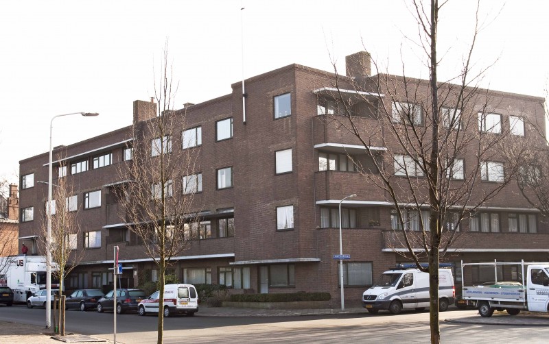 Appartementengebouw en herenhuis uit 1925 op onregelmatige plattegrond ontworpen door J. Wils en F.L.J. Lourijsen volgens de ideeen van het Nieuwe Bouwen.