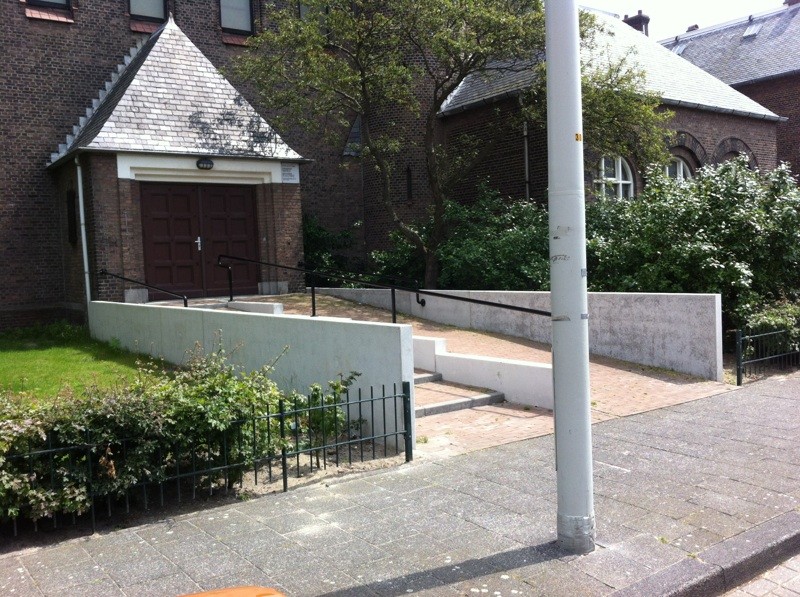 Deze hoofdentree wordt betreden door middel van een hardstenen bordestrap met ter weerszijden pylonen.