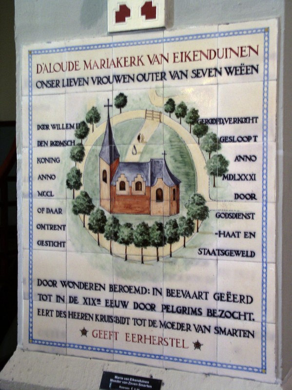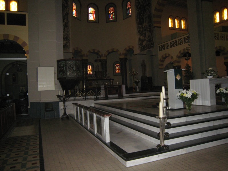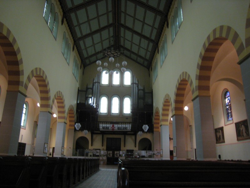 Het interieur heeft rondboog-arcaden op vierkante pijlers waarbij de hoofdbeuken worden beëindigd met beschoten kappen en de zijbeuken met ribloze kruisgewelven op gordelbogen. De lagere, halfronde gesloten hoofdapsis is met een stenen kalot overwelfd. De zijkapellen aan weerszijden van het koor hebben galerijen op rondbogen, gedragen door zuilen met gepolijste granieten schachten en teerlingkapitelen. Ook onder de rondbogen waarmee de lage omgang rond de apsis geopend is, zijn gepolijste granieten zuilen met kapitelen aangebracht waarop de evangelistensymbolen zijn gebeeldhouwd. De vloer is gedekt met in patronen gelegde vierkante tegels van diverse kleuren. In de ramen is veelvuldig gebruik gemaakt van glas-in-lood. Tegen de eindwanden van het transept bevinden zich grote muurschilderingen die uit de jaren zestig van de vorige eeuw dateren. Aan de noordzijde is de bruiloft van Canaän te zien en aan de zuidzijde de Wonderbare Broodvermenigvuldiging. Uit dezelfde periode dateert de geschilderde triomfboog naar de apsis met een voorstelling van de Heilige Drieëenheid en heiligen. De huidige kleurstelling en decoraties op de wanden zijn een versoberde reconstructie van de oorspronkelijke afwerking die in de jaren zestig van de vorige eeuw is verdwenen onder een witte afwerklaag. Vermeldenswaard is voorts een tegeltableau in het metselwerk van de westgevel met een voorstelling van de middeleeuwse kapel op Oud Eik en Duinen. Tot het waardevolle kerkinterieur behoren de in metaal uitgevoerde preekstoel tegen de noord-oostelijke pijler van de viering, de uit de bouwtijd daterende kerkbanken en het tegen de westgevel geplaatste orgel.