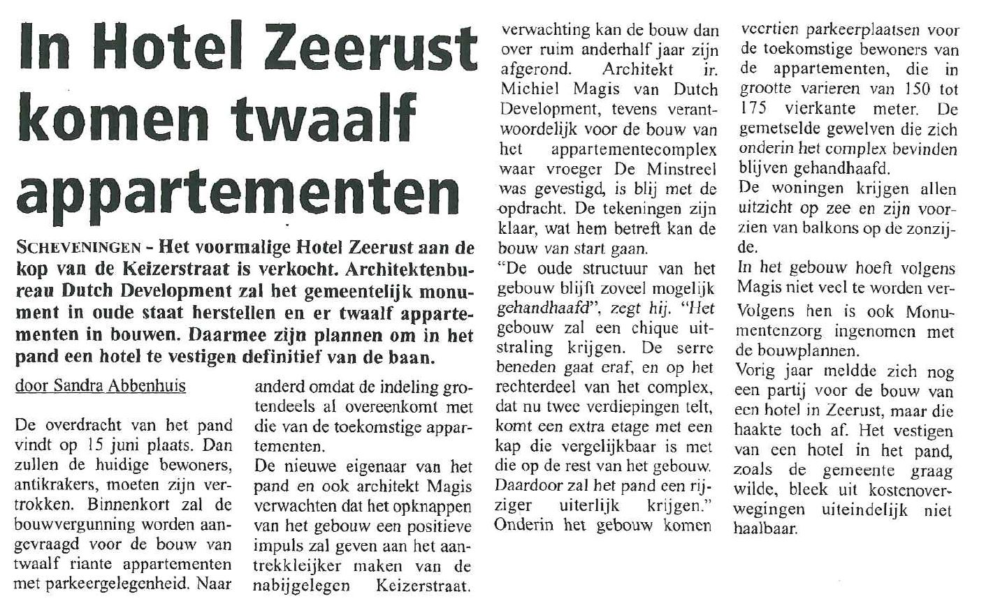 Voormalig hotel Zeerust bestaande uit een uit 1882 daterend hoofdgebouw op de hoek van de Keizerstraat en Zeekant naar ontwerp van de architect H. Westtra jr. in neo renaissancestijl en een uitbreiding uit 1912 langs de Zeekant, eveneens in neo renaissancestijl.
