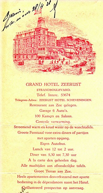 De geschiedenis van het hotel gaat terug tot 1844. In dat jaar kocht de heer A.E. Maas het "heerenlogement"van de toenmalige eigenaar Habraken en stichtte hier een zeebadinrichting onder de naam "Zeerust". In 1846 verbond hij aan deze badinrichting een hotel. De badinrichting heeft tot 1875 bestaan, daarna besloot de initiatiefnemer alleen nog maar als hotelhouder verder te gaan. In 1882 werd Zeerust uitgebreid en verbouwd. Toen verrees het nieuwe hoofdgebouw op de hoek van de Keizerstraat en de Zeekant. Het hotelgebouw op rechthoekige plattegrond bestaat uit kelders, een souterrain en drie bouwlagen onder een kapverdieping. De vleugel langs de Keizerstraat telt zes vensterassen, langs de Zeekant vier vensterassen. De hoek wordt beaccentueerd door een hoektoren, voorzien van een extra bouwlaag boven de kroonlijst.