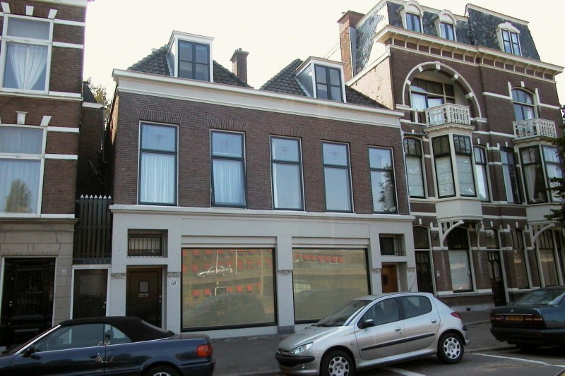Onderdeel van twee panden (nrs. 110 en 111/112) uit ca. 1875 achter een doorlopende voorgevel in een traditionele vormgeving. Beide panden bestaan uit twee bouwlagen onder een met pannen gedekt schilddak. Nr. 110 is twee vensterassen en nr. 111/112 drie vensterassen breed. De parterre is in de loop van de 20ste eeuw vervangen door de huidige pui die de gehele breedte van de voorgevel beslaat. In de muurdammen zijn gebeeldhouwde gevelstenen aangebracht met afbeeldingen die aan een autoherstelplaats refereren.