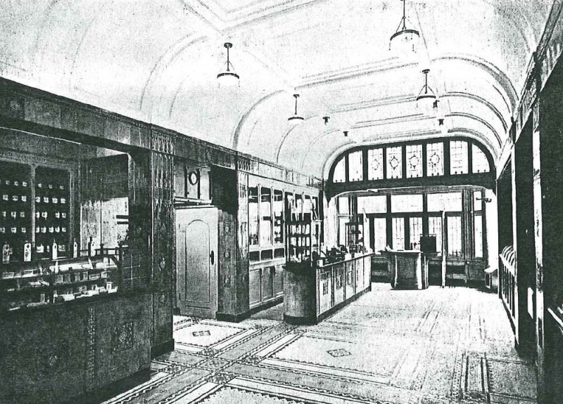 De Korte Poten is als sinds de zestiende eeuw een straat waar bedrijvigheid en handel waren geconcentreerd. Rond 1850 doet het winkelconcept zoals wij dat nu kennen haar intrede en worden veel woonhuis- en bedrijfspuien in de bestaande bebouwing vervangen door winkelpuien. De voortschrijdende cityvorming van de binnenstad en daarmee het alsmaar belangrijker worden van de winkelfunctie voor de Korte Poten zorgt ervoor dat vanaf 1875 veel van de oude panden wordt gesloopt of zodanig verbouwd dat er sprake is van een ware metamorfose. Het pand Korte Poten 7 t/m 7c is hiervan een goede representant. De architecten A.P. van Dam en J.C. van Dorsser die dit brede, in sobere neo-renaissance stijl uitgevoerde winkel-woonhuis ontwierpen, waren in dezelfde tijd bezig met het monumentale warenhuis Grand Bazar de la Paix in de Spuistraat. Veel aandacht is bij Korte Poten 7 t/m 7c besteed aan de detaillering van de winkelzone. De begane grond bevat een gespiegelde winkelpui die uit twee uitgebouwde etalages met een middenportiek bestaat. Rechts is nog een portiek voor de bovenverdieping met een fraai betegelde wand. Bovenlangs loopt een in het zicht gelaten ijzeren puibalk. De etalageramen hebben bovenlichtjes van geslepen glas, die aan de onderzijde door een sierlijk gebogen roede zijn begrensd. Goed bewaard gebleven is het winkelinterieur van de apotheek dat zich in het rechterdeel bevindt (Korte Poten 7a); het is het resultaat van een verbouwing uit 1913 naar ontwerp van Joh. Mutters jr . Architect Mutters bekleedde de wanden en de toonbanken met zachtgroen geglazuurde tegels waar farmaceutische, religieuze en astrologische symbolen op zijn aangebracht. Bijzonder is de esculaap, geflankeerd door papavers, boven het fonteintje in de nis. Onder de esculaap is een klein maskerkopje, een spuwertje, waar de oorspronkelijke kraan zich bevond. Deze was destijds aangesloten op een eigen bron. De medicijnkasten zijn in de tegelwand opgenomen. Boven de ruimte welft een eenvoudig gedecoreerd stuukplafond. Oorspronkelijk had de apotheek een mozaïekvloer, maar deze is door marmer vervangen. Opvallende interieurdetails zijn verder de open etalagekast kast met een glas-in-lood bovenlicht en de scheidingswand tussen de winkel en de apotheekruimte met gesneden houten staanders achterin. Glas-in-lood bevat ook het plafond van de apotheekruimte. Het tegelwerk werd uitgevoerd door firma A.N. de Lint Industrie- en Handel Maatschappij. De tegels betrok zij van de Porceleyne Fles in Delft. Van deze fabriek had De Lint sinds 1898 het exclusieve recht van de verkoop van hun producten.