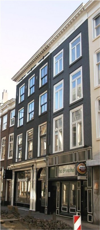 Fors pand met vroeg 19e eeuws uiterlijk bestaande uit vier bouwlagen in totaal vijf traveeen breed. Het pand herbergt twee casco's, een van drie traveeen en een van twee traveeen breed. In het geveluiterlijk komt dit tot uitdrukking in het verschillend transformatieproces, met name de verhoging van twee vensters op de derde bouwlaag en de twee gescheiden winkelpuien. De linker winkelpui dateert uit het laatste kwart van de 19e eeuw in rijke eclectische stijl; de rechter is een recentelijk weer gemoderniseerde pui uit de jaren dertig van deze eeuw. De bakstenen lijstgevel bezit een over beide casco's doorlopende geprofileerde kroonlijst met gesneden versieringen.