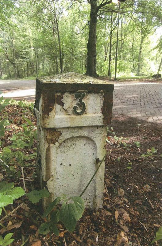 In de rij tussen 2 en 3.7 km is een aantal gaten gevallen die in de twintigste eeuw zijn opgevuld met palen van gewapend beton (5 stuks). Vier daarvan zijn identiek. Ze hebben een vierkante vorm met afgevlakte hoeken, een doorsnede van 18 cm en een diamantkop. Aan de achterzijde zijn de letters R.G. ingegoten. Dergelijke palen geven de grens aan van het Rijksgebied. De laatste paal op rij, tegenover de ingang van Leidse straatweg 15 is een betonnen paal met een vlakke top en een groef aan de achterzijde.