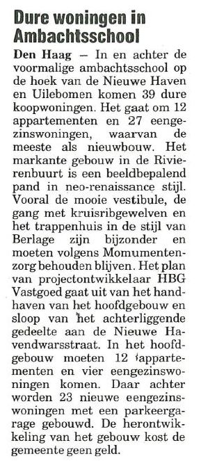 Rond 1990 vertrok de ambachtsschool, inmiddels lagere technische school, uit het gebouw. In 1999-2002 werd de school herbestemd tot appartementencomplex. Niet alles is daarbij behouden in het interieur, ook de vleugel aan de kant van de Nieuwe Havendwarsstraat is gesloopt en vervangen door nieuwbouw. Wel bewaard en gerestaureerd zijn de vestibule en gang met de gemetselde kruisribgewelven met hierin het monumentale trappenhuis. In dit trappenhuis is een gebrandschilderd Art Deco raam aangebracht t.g.v. het jubileum van de "Vereeniging De Ambachtsschool te 's-Gravenhage" in 1923.